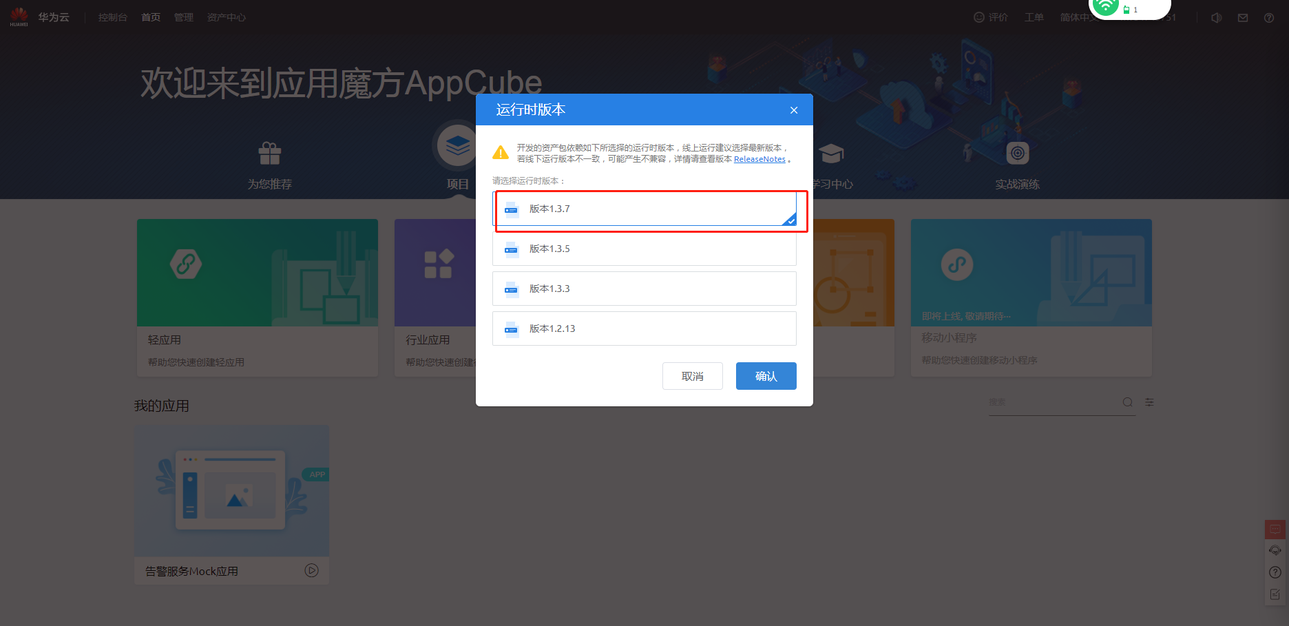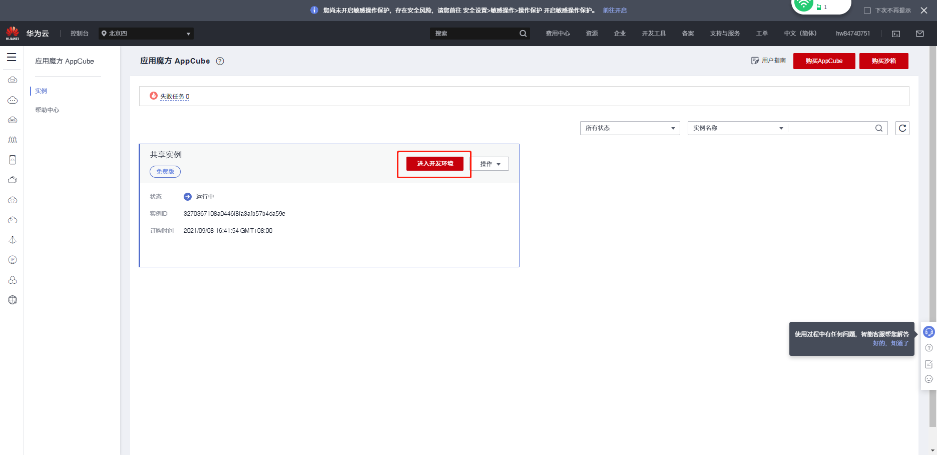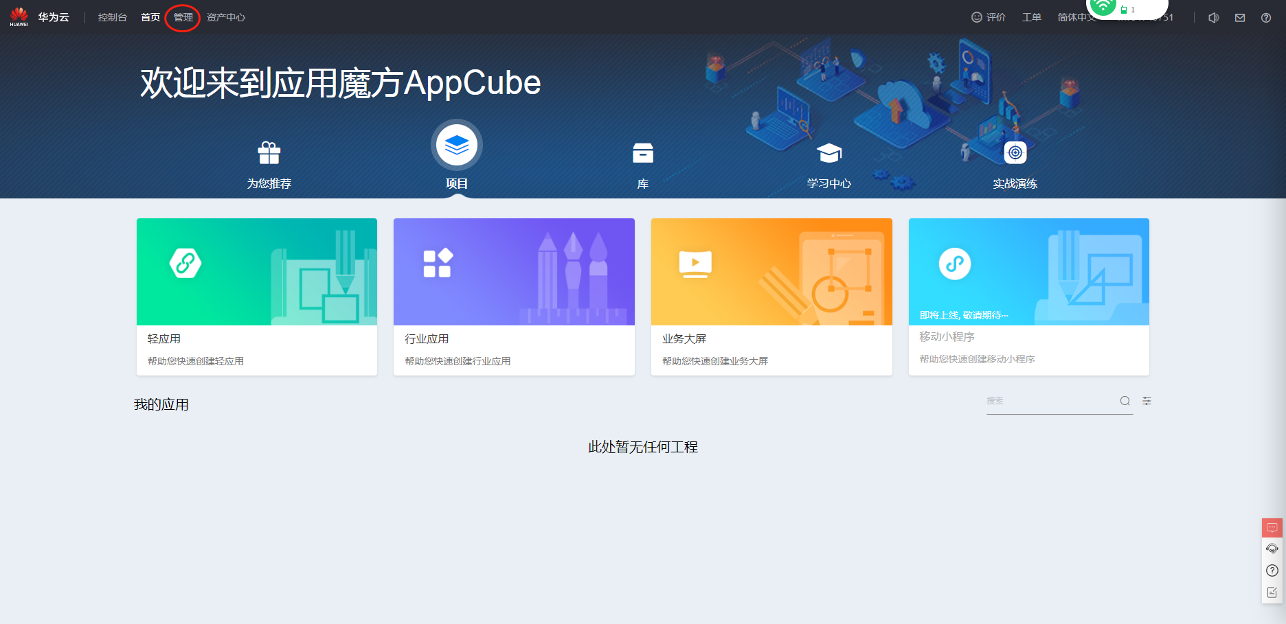 进入Appcube https://console.huaweicloud.cn/appcube/?locale=zh-cn®ion=cn-north-4#/home