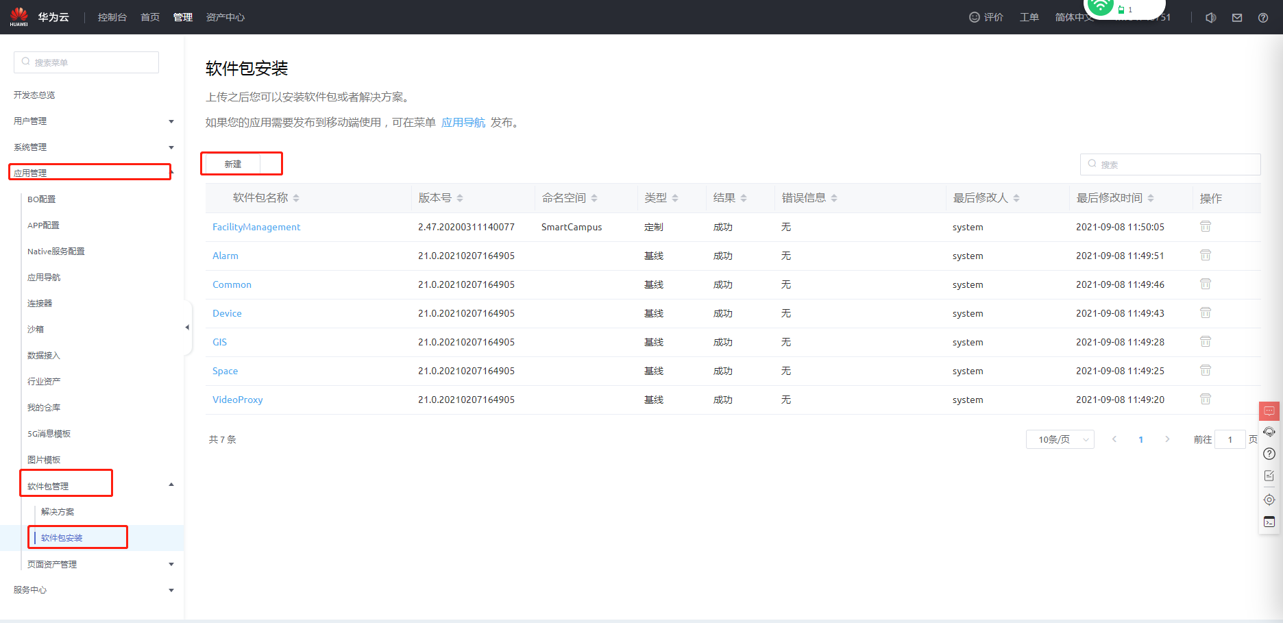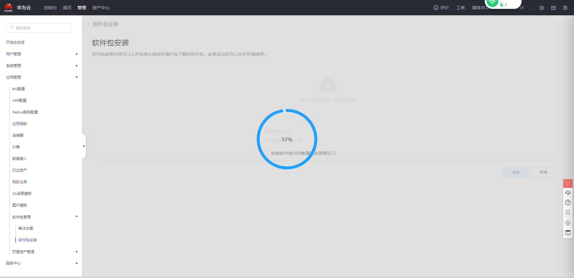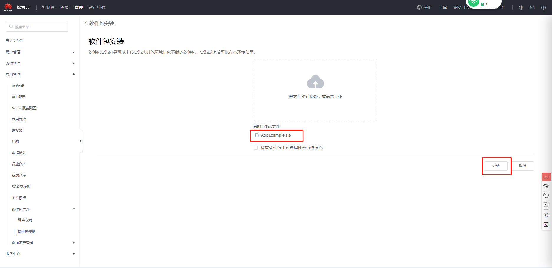 - 获取应用包“AppExample.zip”,在开发环境首页单击“管理”,选择“应用管理 > 软件包管理 > 软件包安装”,单击“新建”,将应用包拖入进去安装。