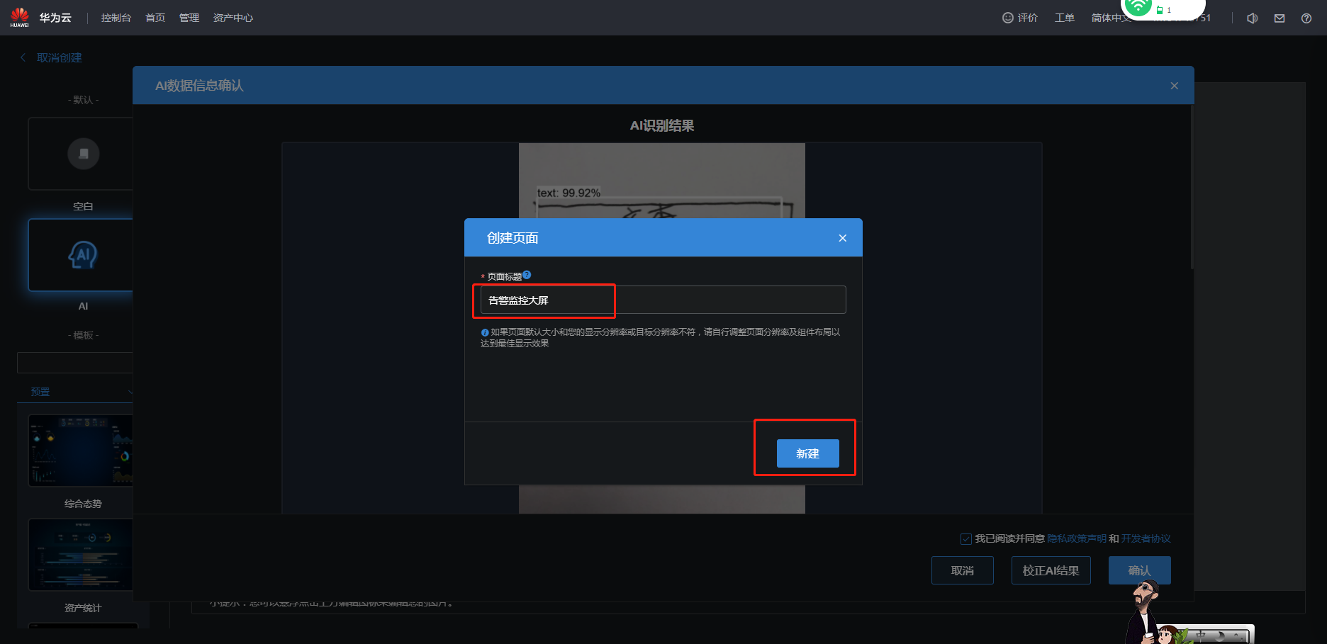 - 输入页面标题“告警监控大屏”,单击“新建”。