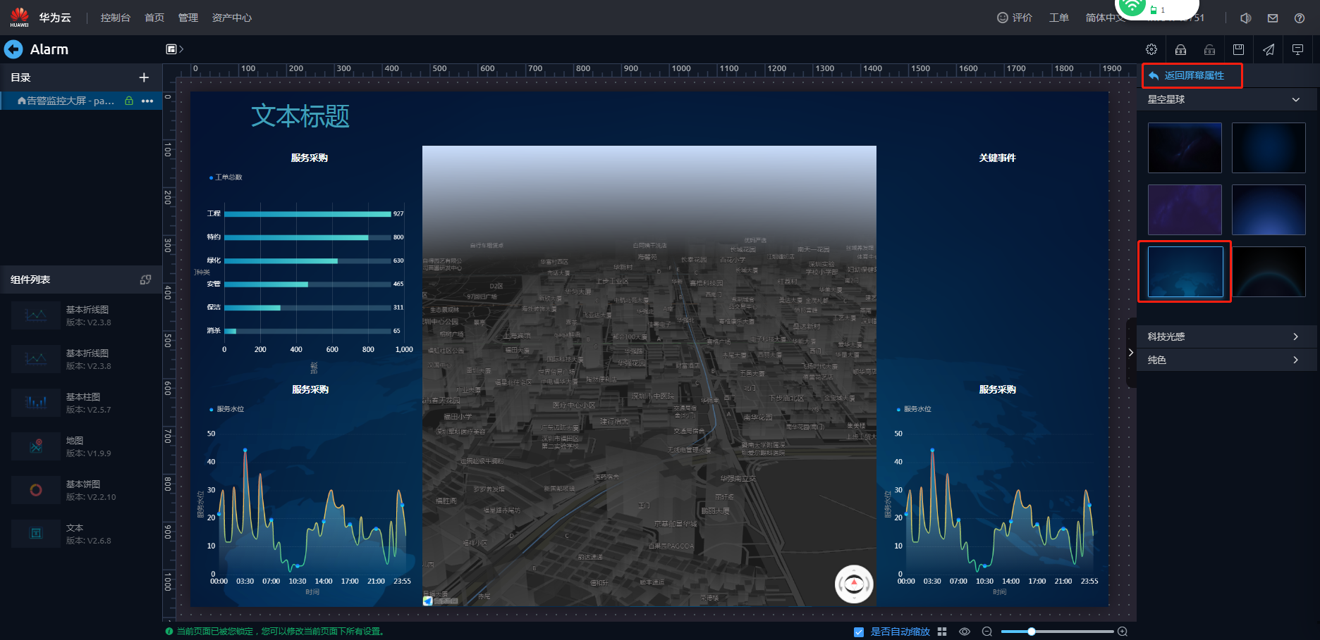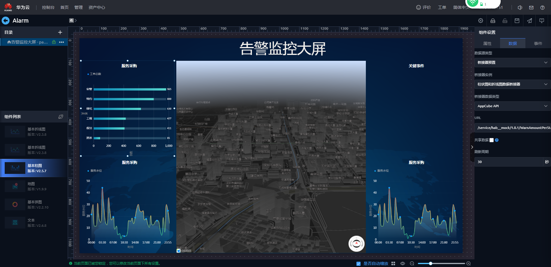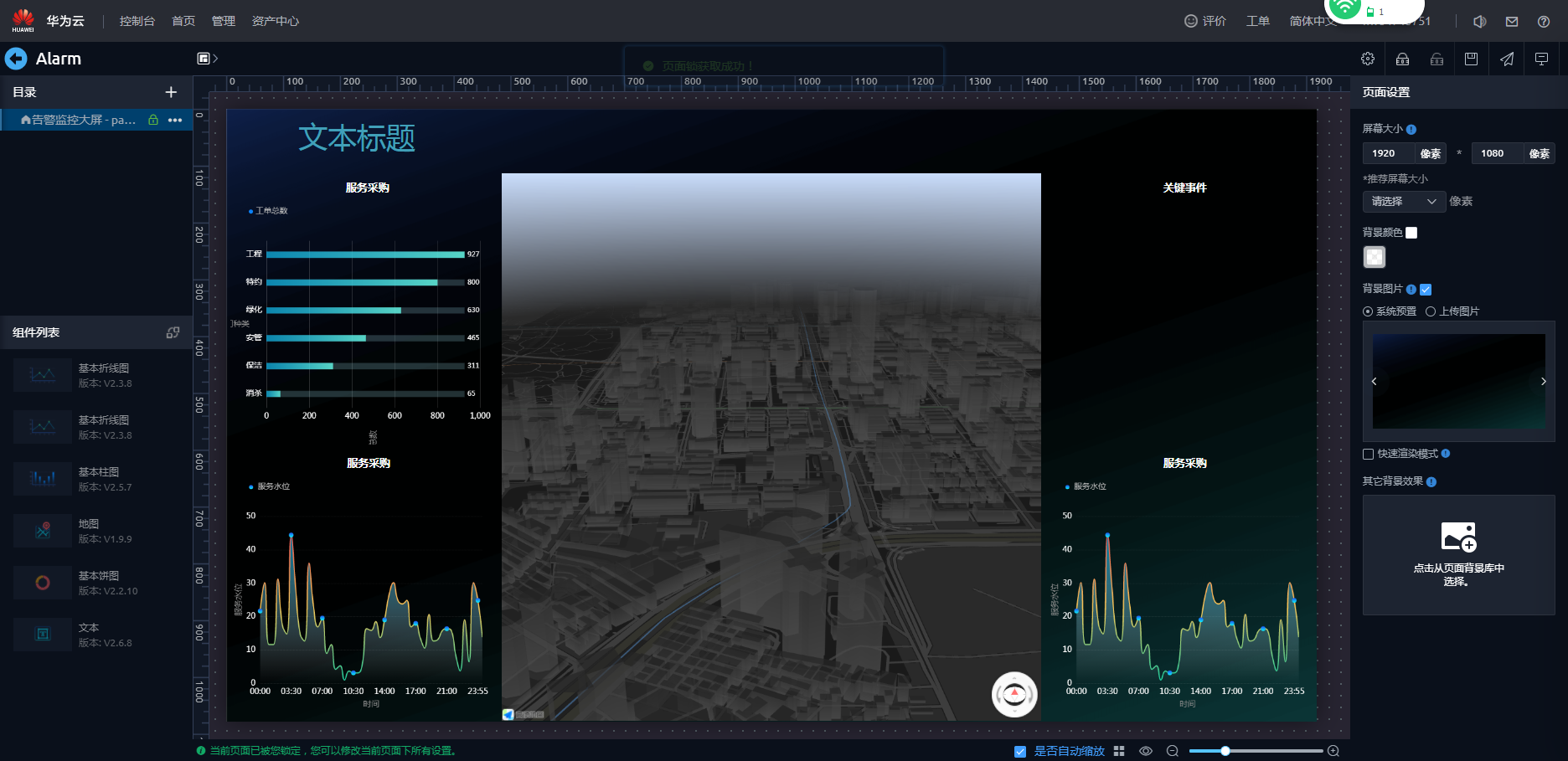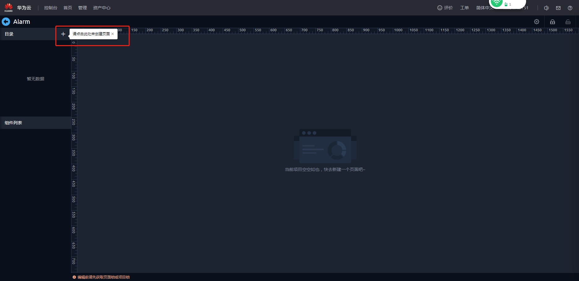 - 在弹出的提示框“在锁定页面告警监控大屏前,所有页面将会自动更新至最新版本。”,单击“确认”。即可进入页面开发界面。
