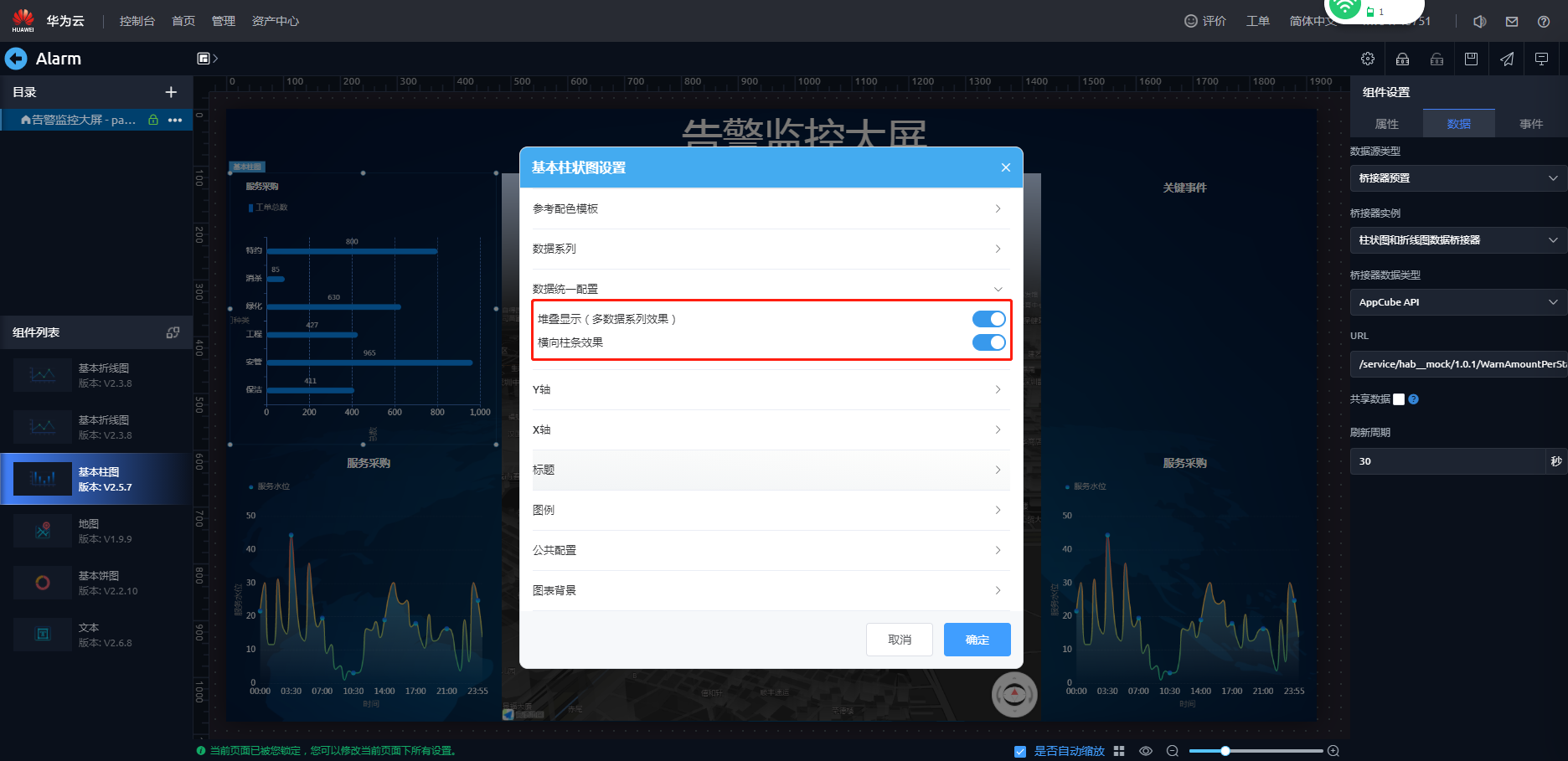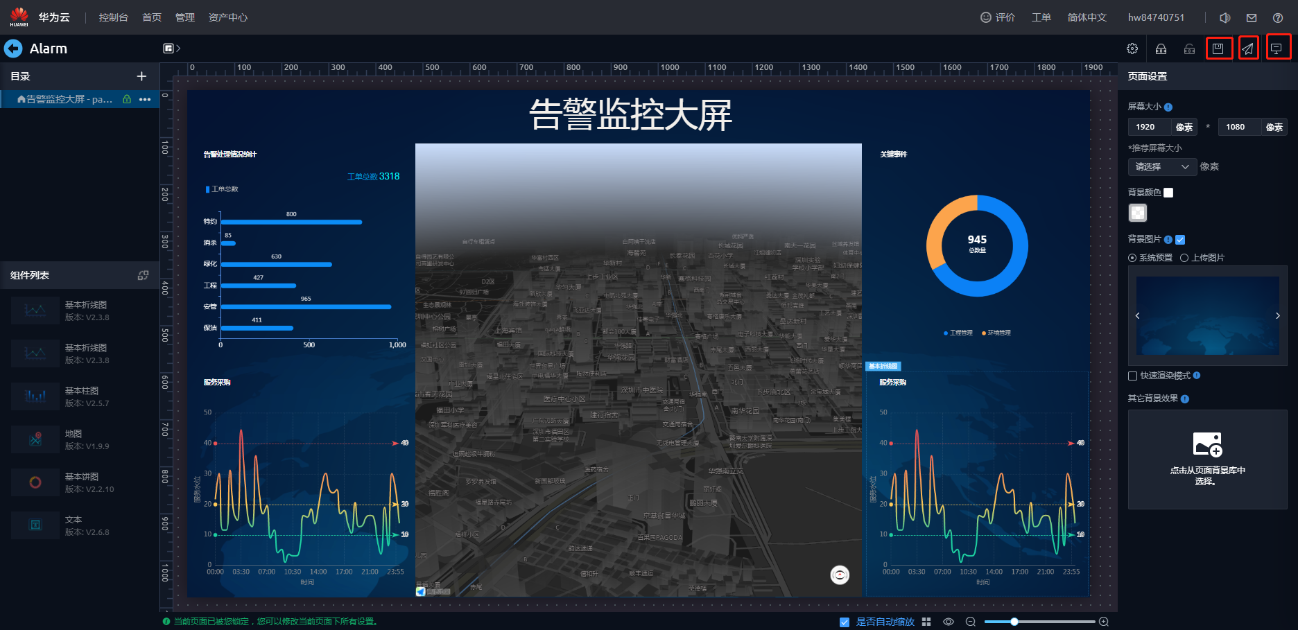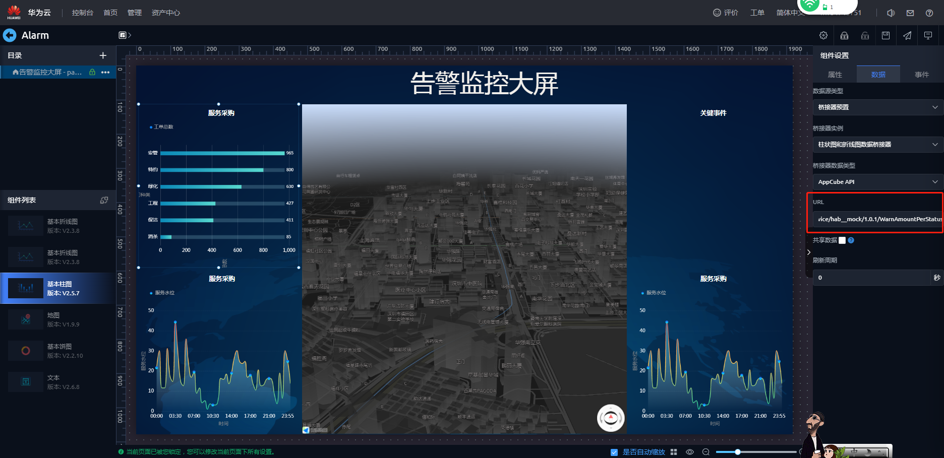 - 在弹出的提示框“在锁定页面告警监控大屏前,所有页面将会自动更新至最新版本。”,单击“确认”。即可进入页面开发界面。