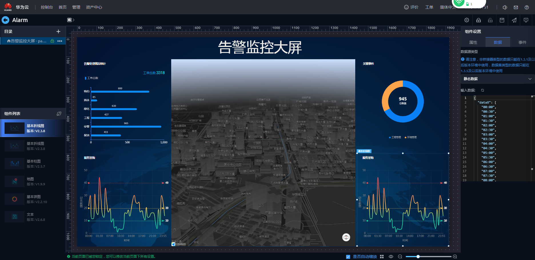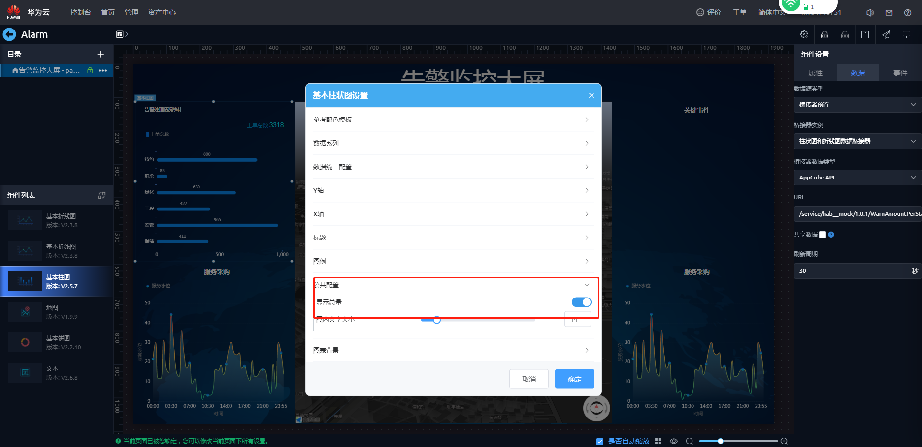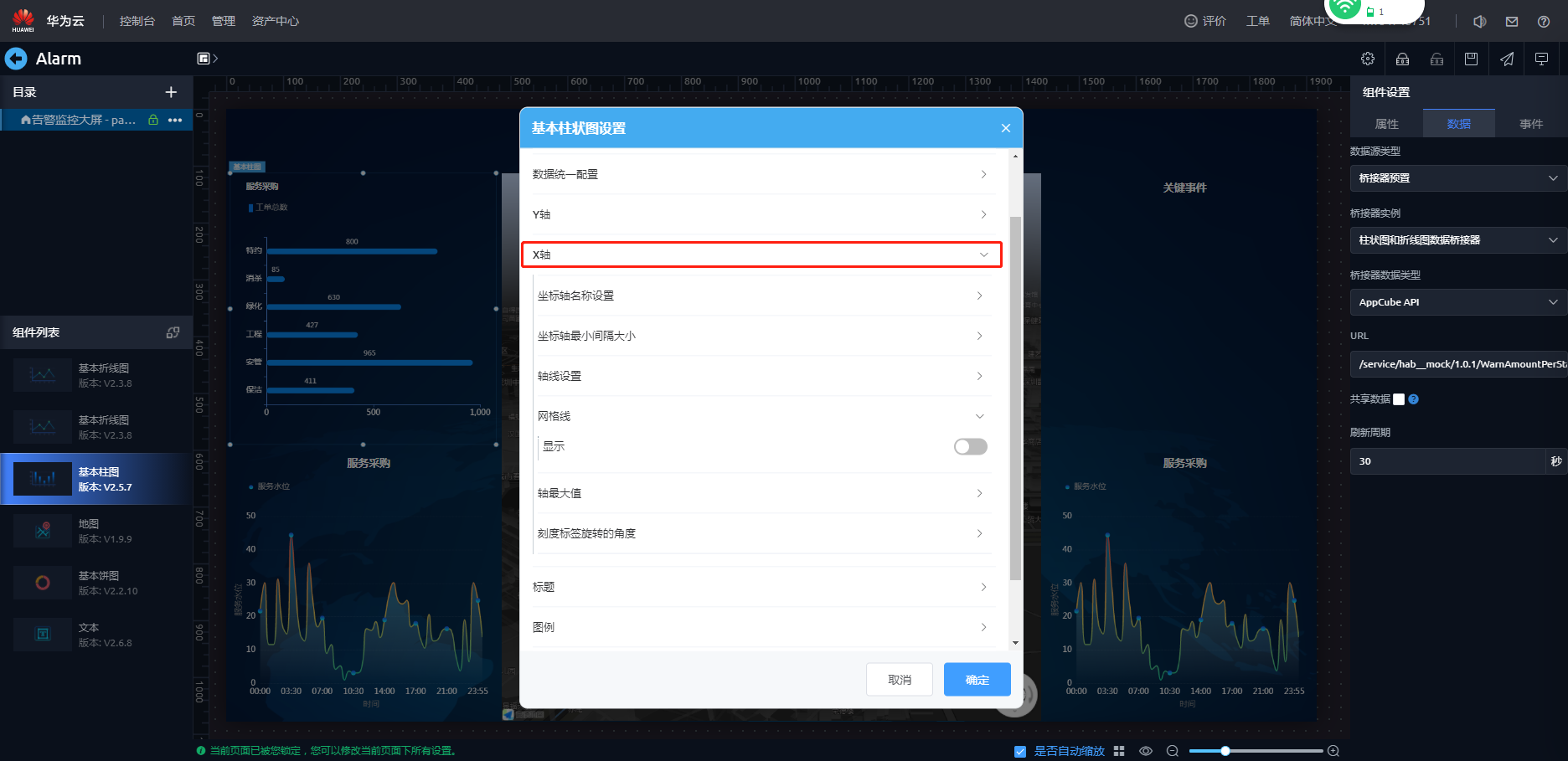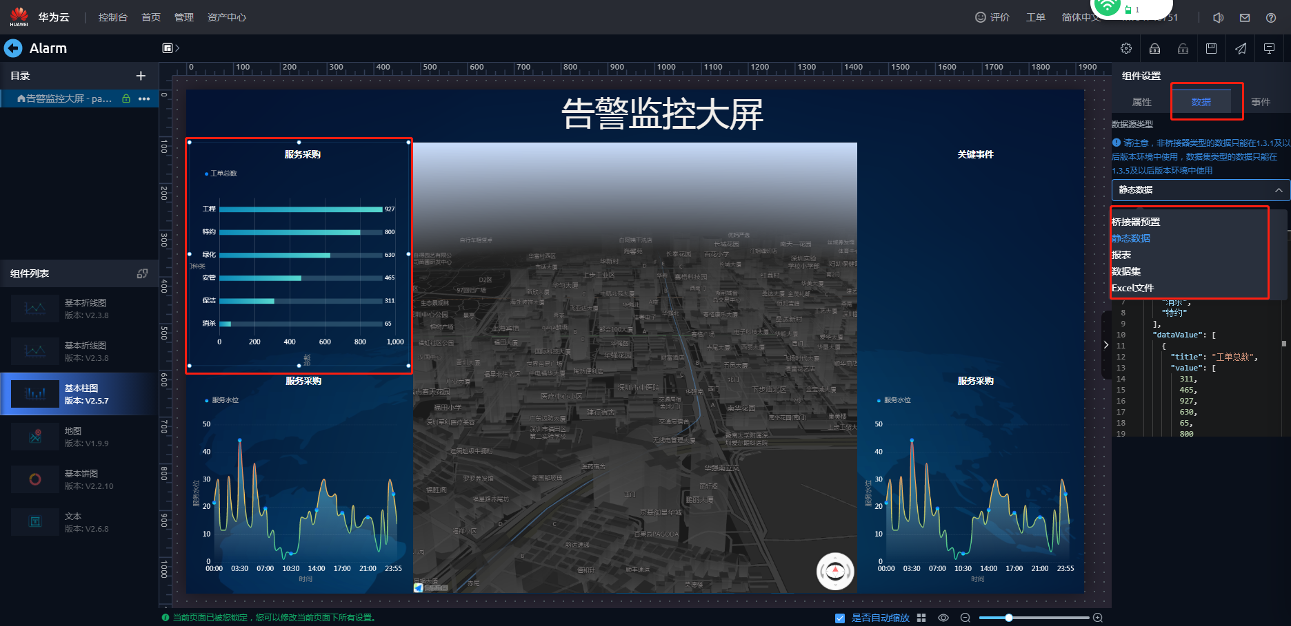 - 在弹出的提示框“在锁定页面告警监控大屏前,所有页面将会自动更新至最新版本。”,单击“确认”。即可进入页面开发界面。