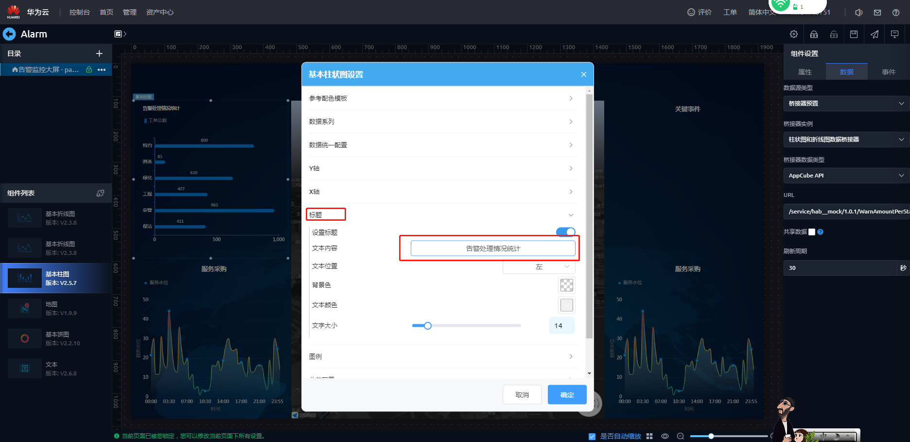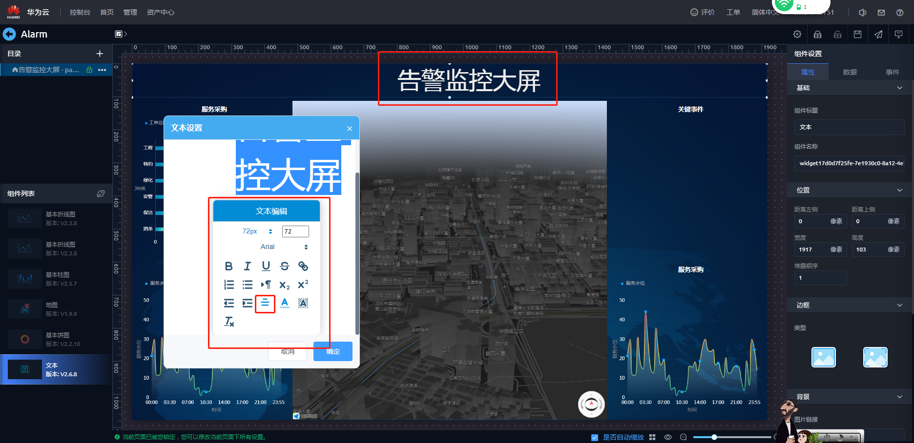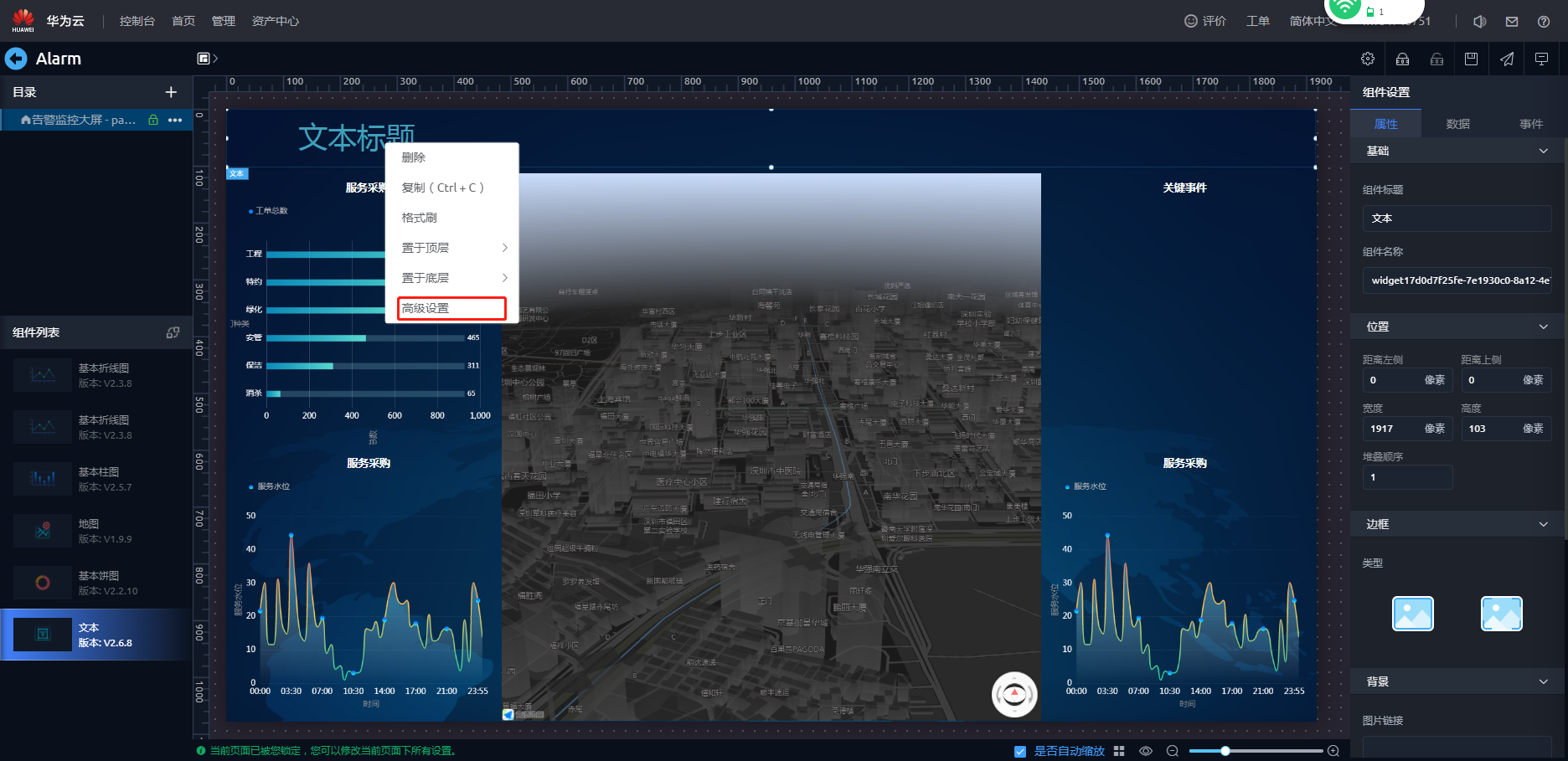 - 配置文本组件,设置“告警监控大屏”标题。选中左上角文本组件“文本标题”,单击鼠标右键选择“高级设置”,