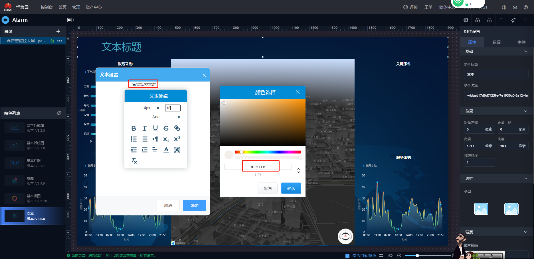 - 设置文本内容为“告警监控大屏”,选择设置的文本内容,出现配置弹窗,配置文本颜色为“#F2EFEB”。