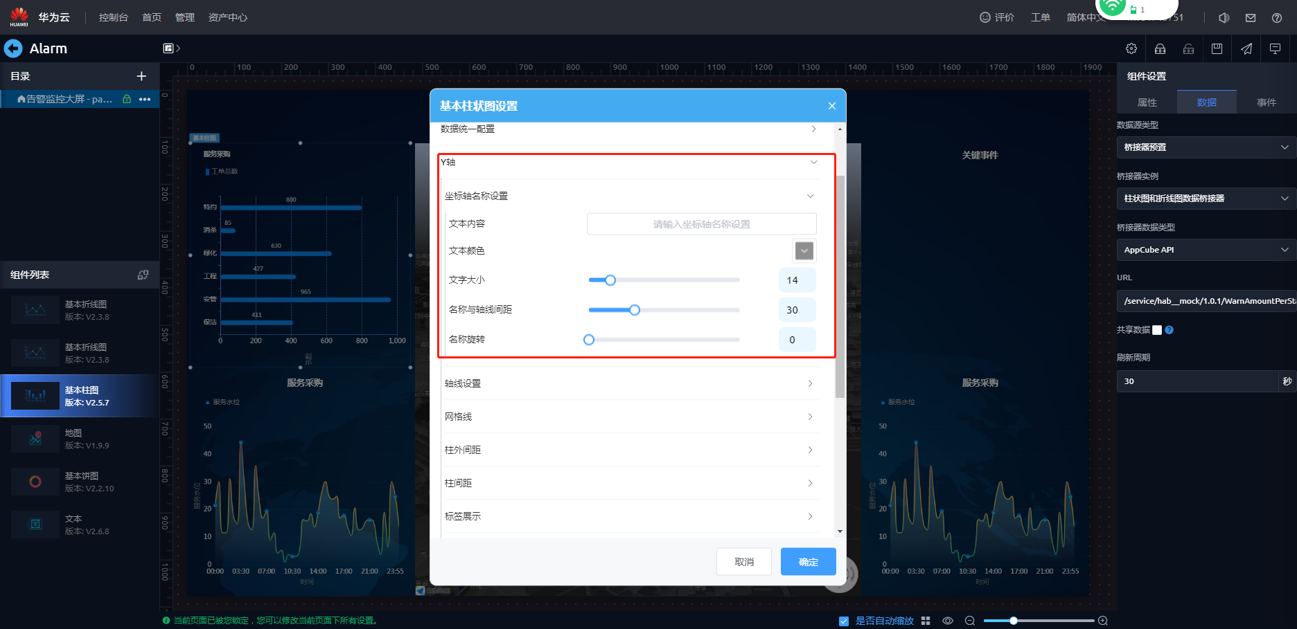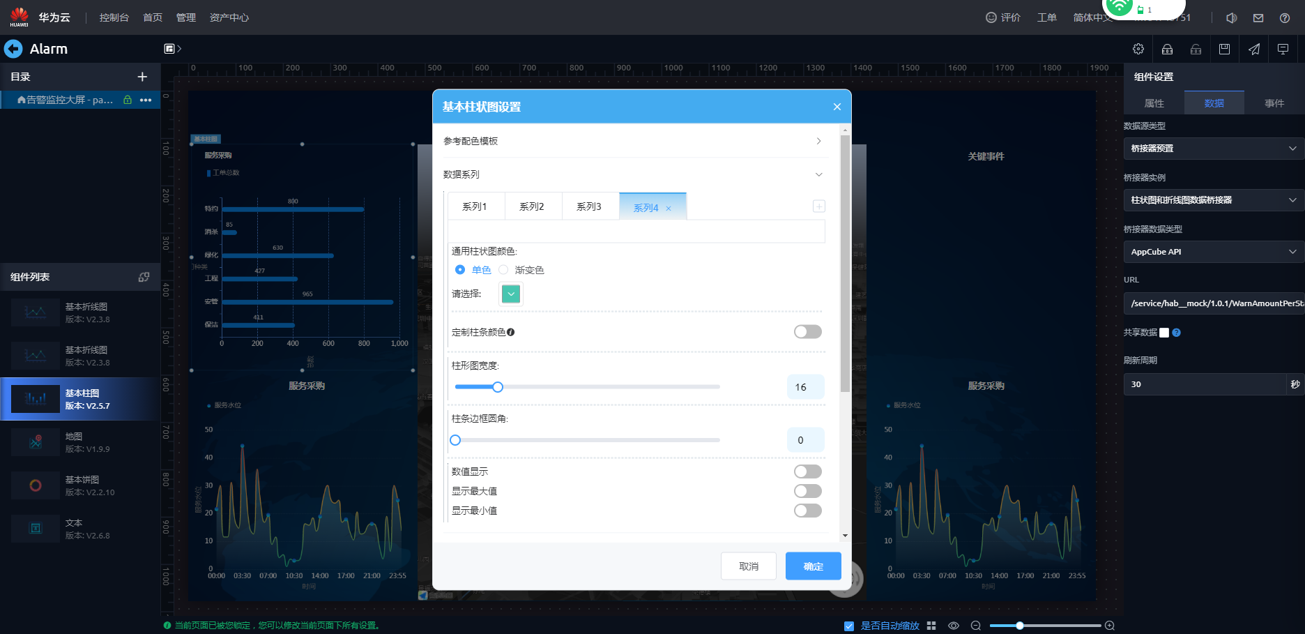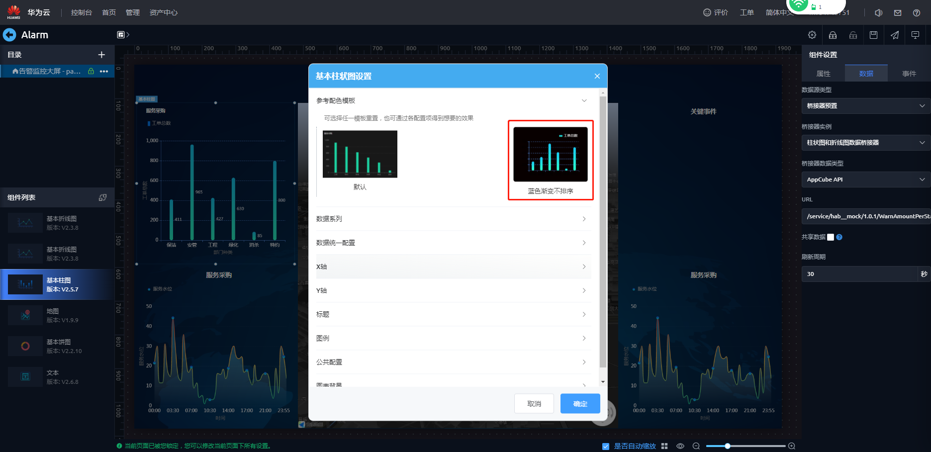 - 配置基本柱图组件样式,配置数据源。选择基本柱图组件,在页面右侧选择“数据”页签,配置桥接器。