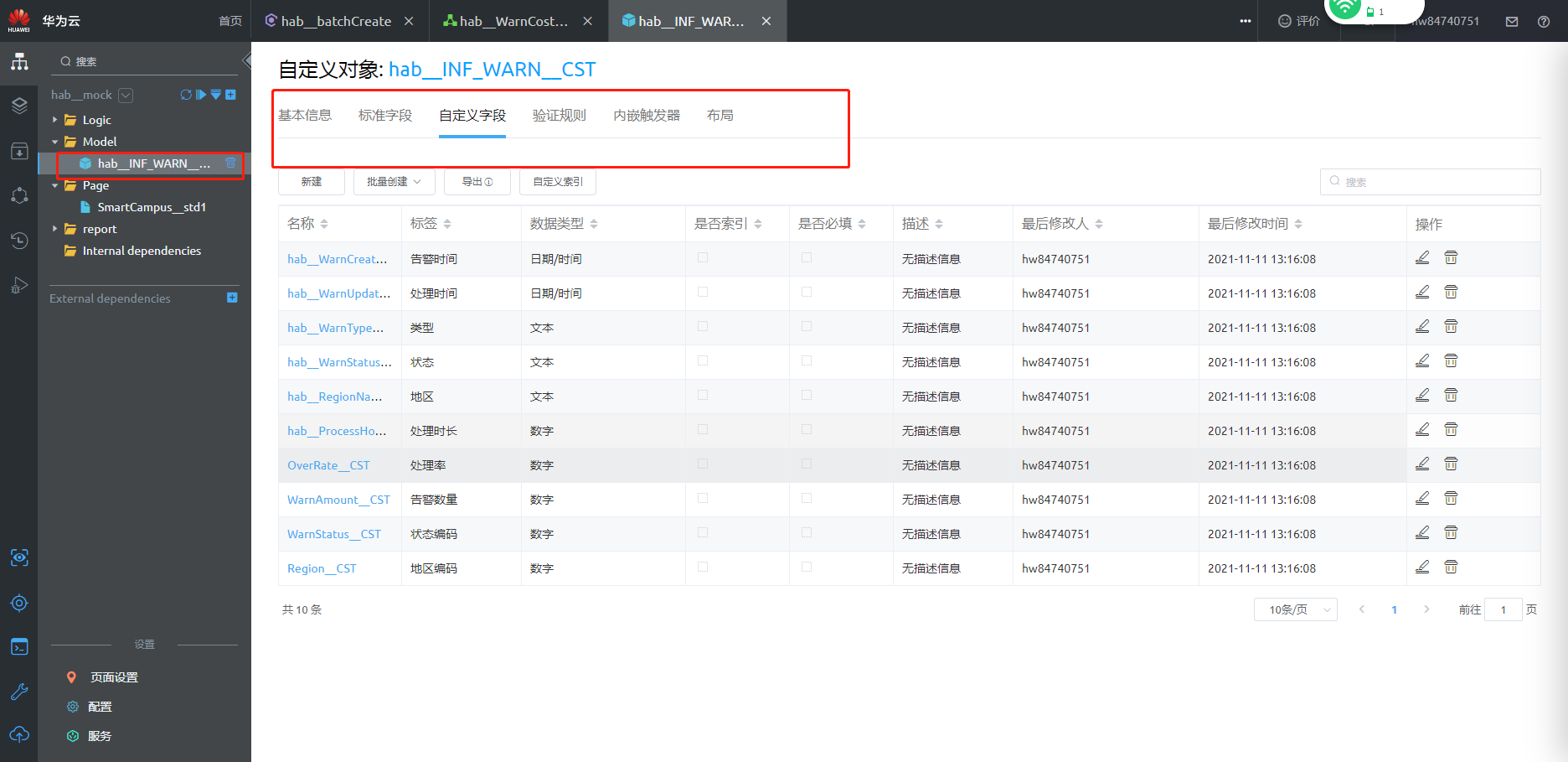 - 在Model文件夹下可查看到模型对象告警对象“hab__INF_WARN__CST”的字段信息
