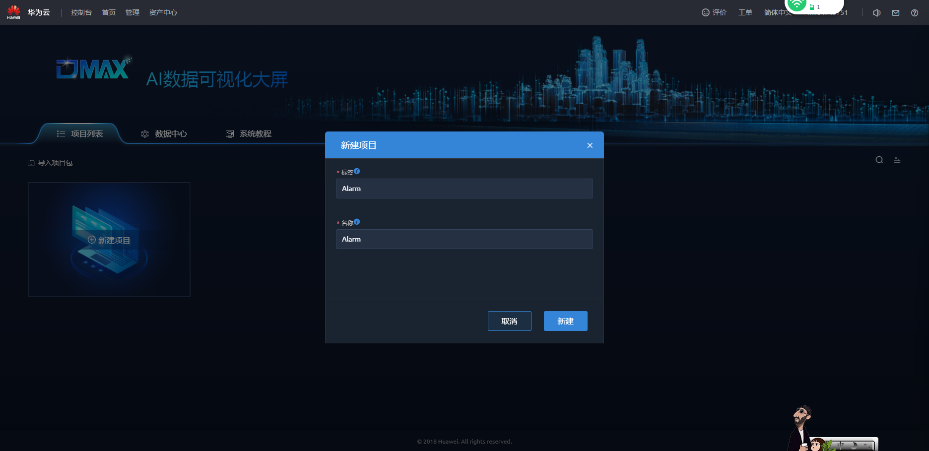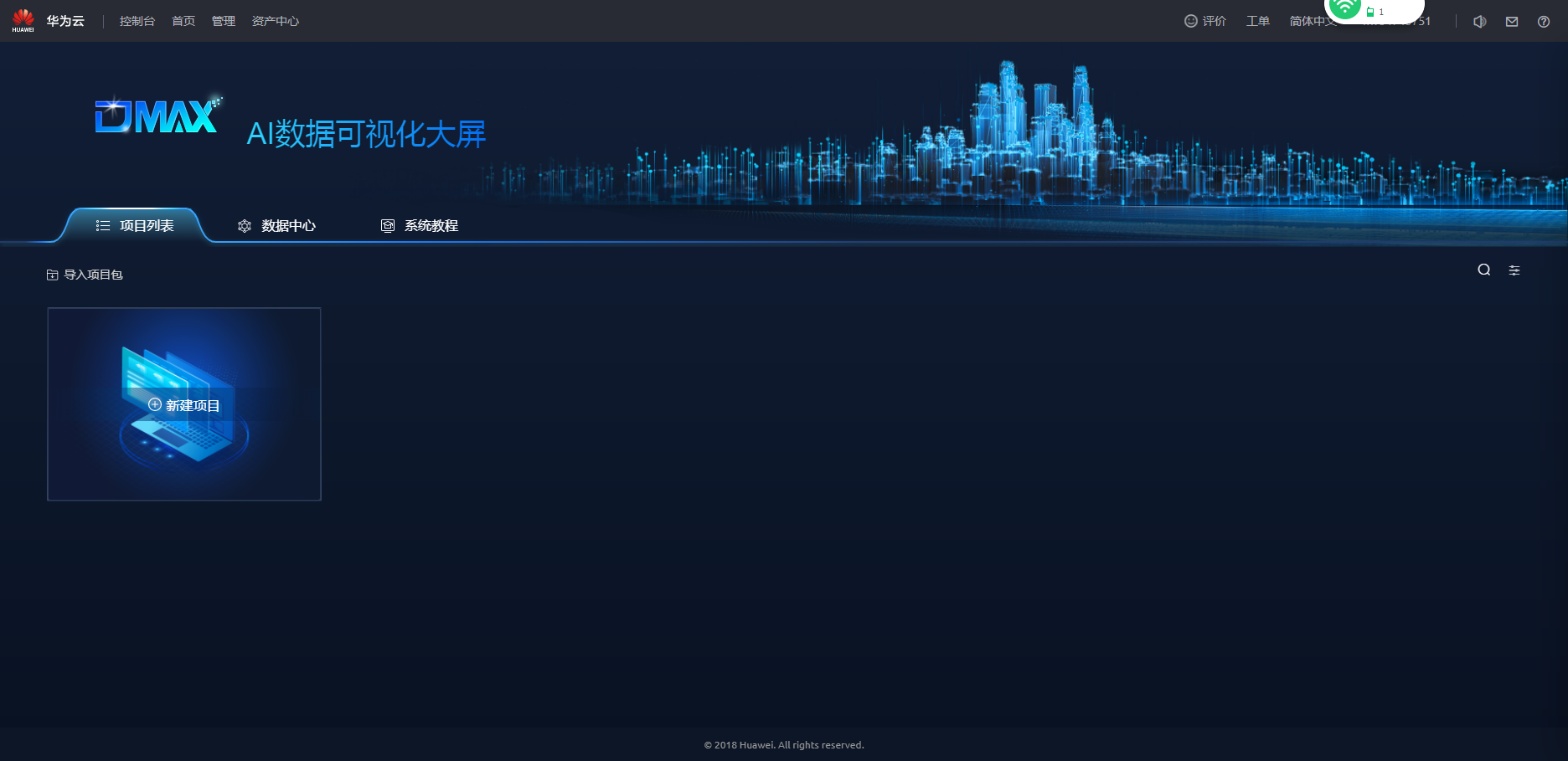 - 在“DMAX AI数据可视化大屏”界面,单击“新建项目”。