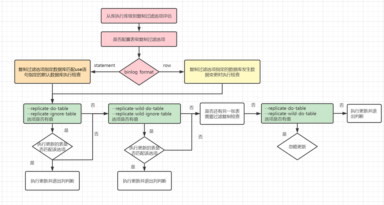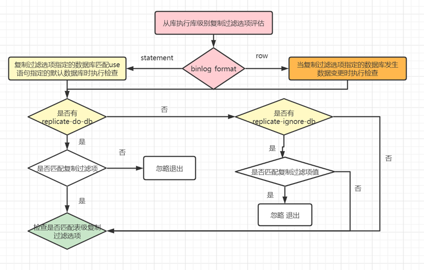 2 查看是否存在--replicate-ignore-db选项, 如果存在,在默认数据库包括在--replicate-ignore-db中的更新不会在从库上执行,其他库的更新进行下一步表级别的过滤 当--replicate-do-db和--replicate-ignore-db同时存在时,--replicate-do-db的优先级更高,不在--replicate-do-db中的库不会在从库上复制。 当binlog_format=ROW时,DML语句的默认数据库根据更新的内容自动获取,但是DDL语句的默认数据库需要通过USE指定