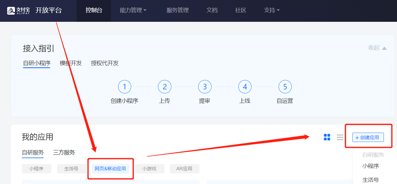 【摘要】 1、 登录支付宝开放平台地址https://openhome.alipay.com/platform/home.htm 2、 登录进入后,选择“网页&移动应用” 3、 点击右上角的“创建应用” 4、 选择“网页&移动应用”-》“支付接入” 5、 根据要求,填写相关信息即可田马相关可填写: http://xxx/winewap/ 6、 注意,如果是网页应用,要提前准备移动端的网页地址。要注意...