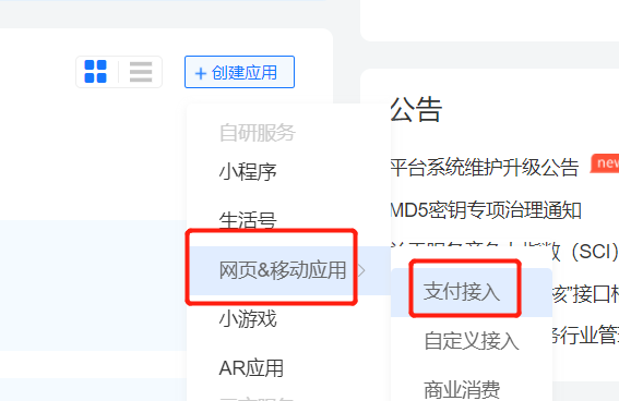 4、 选择“网页&移动应用”-》“支付接入”