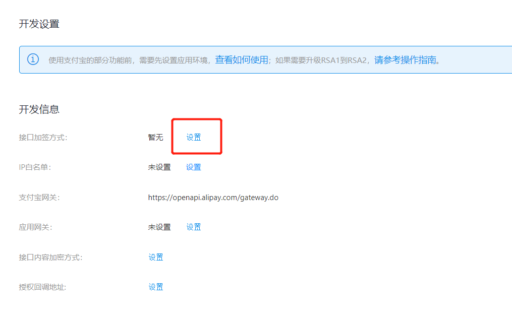 8、 向页面的下面拉,找到“开发信息”。点击“接口加签方式”,右面的“设置”按钮。