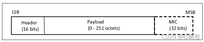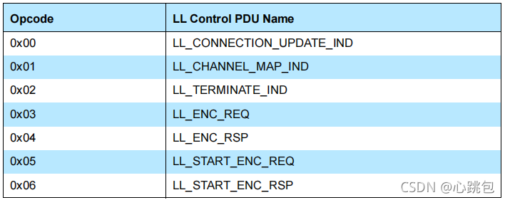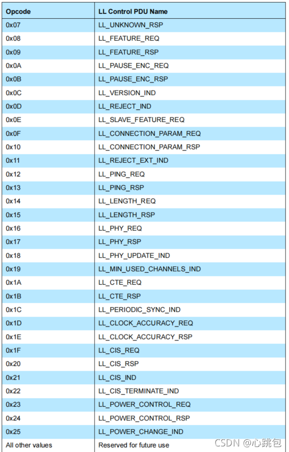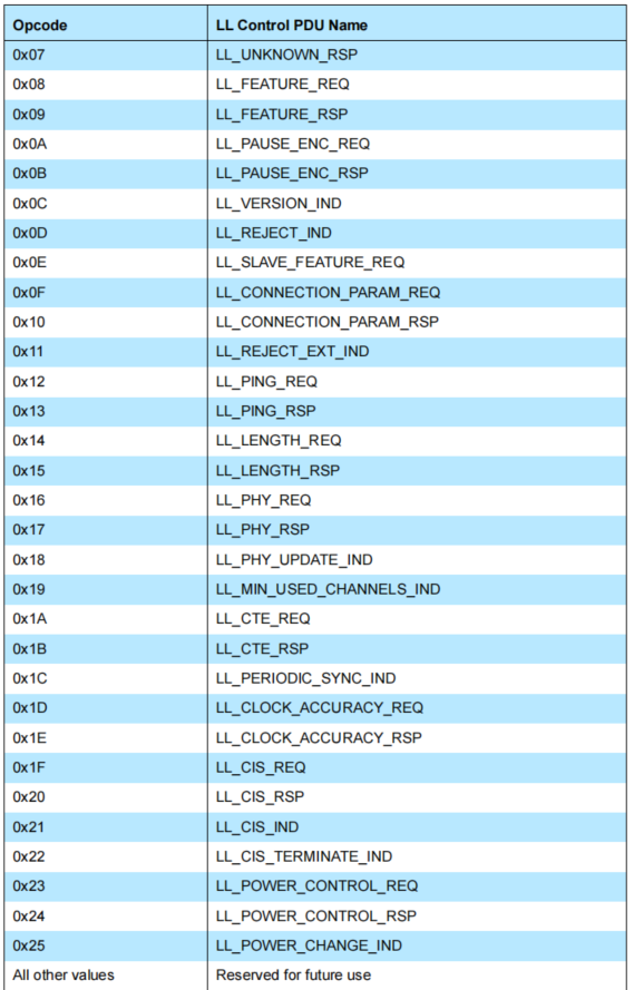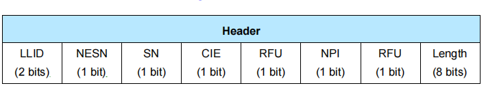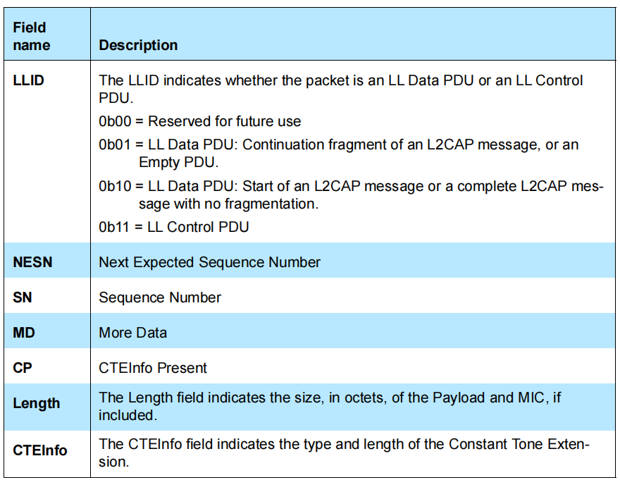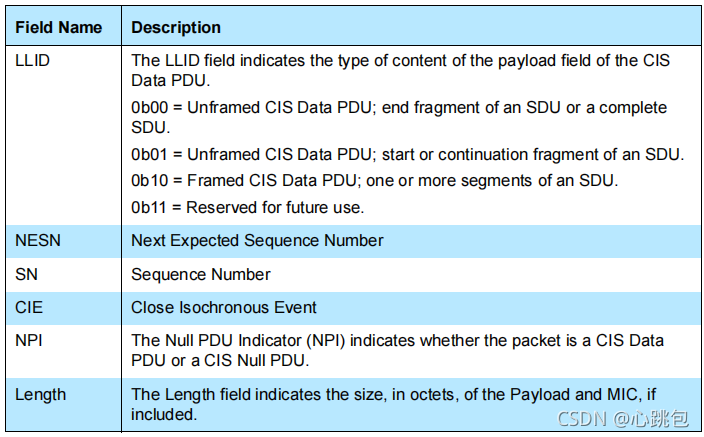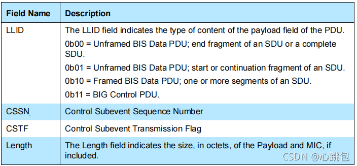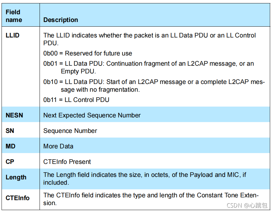 | PDU | 序言和访问地址后面是一个PDU。当数据包在主或次广告物理频道或周期物理通道上传输时,PDU应为第2.3节定义的广告物理频道PDU。当数据包在数据物理信道上传输时,PDU应为第2.4节中定义的数据物理信道PDU。当数据包在等时物理信道上传输时,PDU应为第2.6节中定义的等时物理信道PDU之一。 |