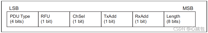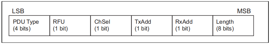 广告物理通道PDU有一个16位的报头和一个可变大小的有效负载。其格式如图2.4所示。广告物理通道PDU的16位头字段如图2.5所示。