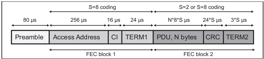 以下数据包格式是为LE编码的PHY定义的,并用于所有物理通道上的数据包。