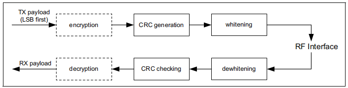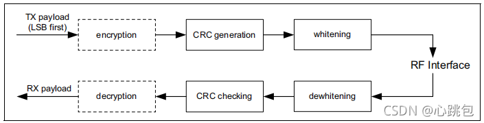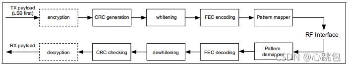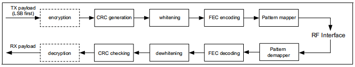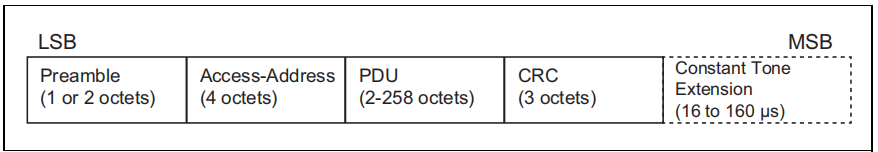 先传输preamble,然后按该顺序传输访问地址、PDU、CRC和Constant tone extension(如果存在)。整个分组以相同的符号速率传输(1Msym/s或2Msym/s调制)。