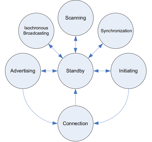 待机状态是链接层中的默认状态。链路层不得在备用状态下发送或接收数据包。链接层可以离开待机状态,以进入广告状态、扫描状态、发起状态、同步状态或同步广播状态。