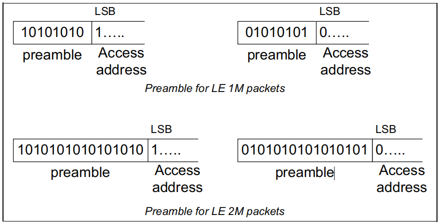 | Preamble | 所有链路层数据包都有一个前置码,用于执行频率同步、符号定时估计和自动增益控制(AGC)训练。前缀是一个由0位和1位交替组成的固定序列。对于在LE1MPHY上传输的数据包,序言为8位;对于在LE2MPHY上传输的数据包,序言为16位。序言的第一位(按传输顺序排列)应与接入地址的LSB相同。序言如图2.2所示。 |