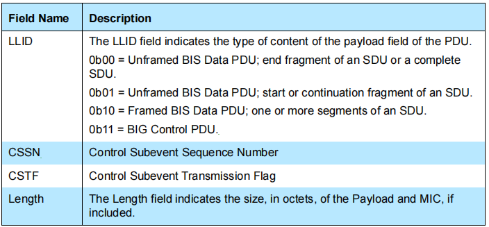 处于同步广播状态的链路层状态机的每个实例都应传输一个由一个或多个BISes组成的大实例。每个BIS都携带一个单独的等时数据流。一个最多有31个Bisec。
