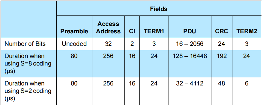 表2.1:LE编码的PHY字段大小和持续时间,单位为微秒