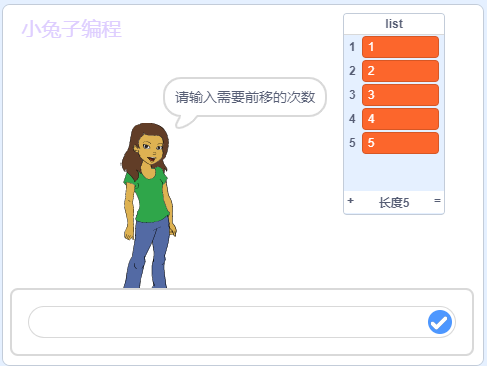 小红在列表里面存了一些数据, 但是发现顺序是错的, 经过比对,只需要将列表中的每项数据向前移几位就是正确的顺序, 首尾是相连的,如果第一项前移 1 位,那么就移动到了末位。比如列表中的数据为 1,2,3,4,5 ,每项数据向前移 1 位,那么移动后列表中的数据就变为 2,3,4,5,1。