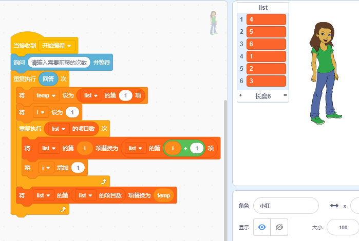 小红在列表里面存了一些数据, 但是发现顺序是错的, 经过比对,只需要将列表中的每项数据向前移几位就是正确的顺序, 首尾是相连的,如果第一项前移 1 位,那么就移动到了末位。