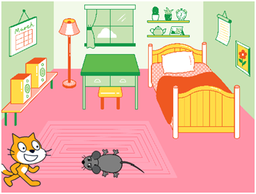 (1) 初始的背景为 Bedroom1,小猫的初始位置在屏幕左下角,面向右边, Mouse1在小猫不远处,面向左边;