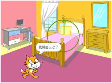(2)点击绿旗小猫说“我要去运动了” 1秒,背景切换为basketball2,小猫切换造型,向右走几步,说“该回家了!”1秒
