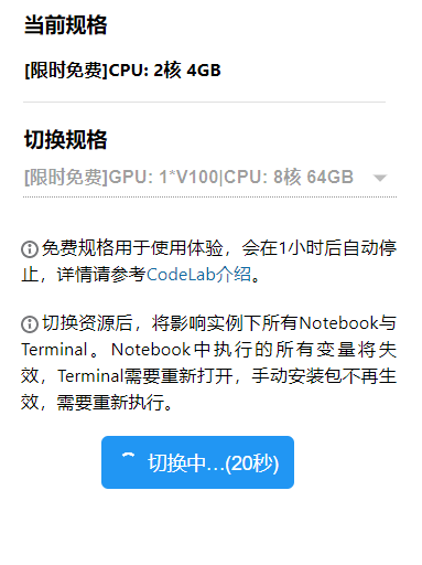 该实验需要是到GPU,首先进行资源切换,如下图