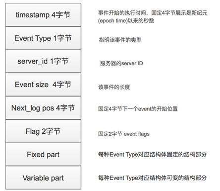 | timestamp记录的是该事务记录的时间 type_code,记录的是该event的类型,具体的event类型,见上面的Log_event_type server_id,记录的是执行该event的server的server_id号 event_length,该event的长度,共占多少字节 next_position,下一个event在binlog文件中的偏移位置 flag:标记 extra_headers,额外的头部内容,现在是空的,不存在 fixed part有些时候也被称作post-header variable part有些时候也被称作payload或者body |