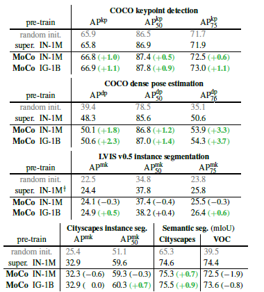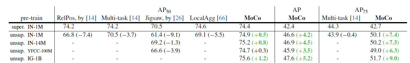 无监督学习的主要目标就是学习具有可迁移性的特征,ImageNet监督预训练在作为下游任务微调的初始化中的影响是最大的。本文对比了MoCo和ImageNet监督训练得到的模型,在迁移到不同数据集上不同任务的表现。在大部分情况下,MoCo都得到了优于ImageNet监督训练的表现。