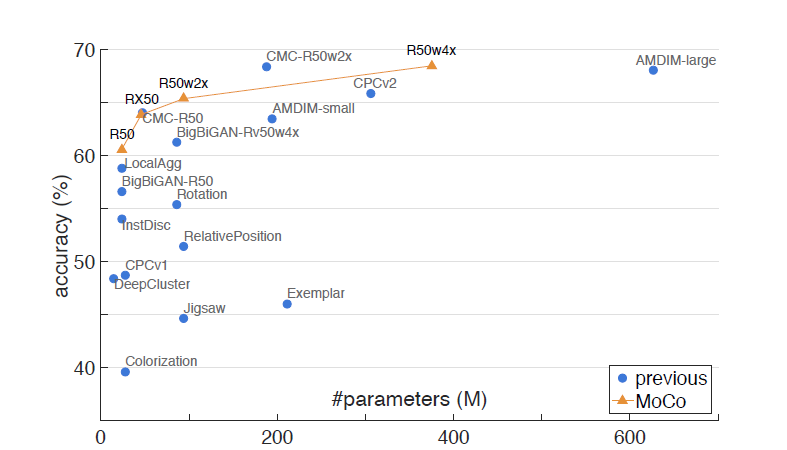 和以往方法的关系。MoCo是一个通用的利用对比损失函数进行学习的机制。本文将它和现有的另外两种通用机制(如图二)进行了对比,他们的不同特性主要体现在字典大小和一致性这两个方面上。