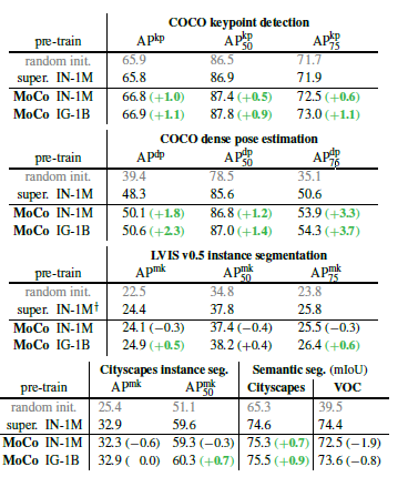 图七 MoCo和ImageNet有监督预训练在其他任务上的对比