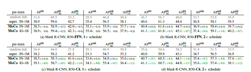 图六 目标检测和实例分割任务在COCO上的微调与ImageNet监督训练对比