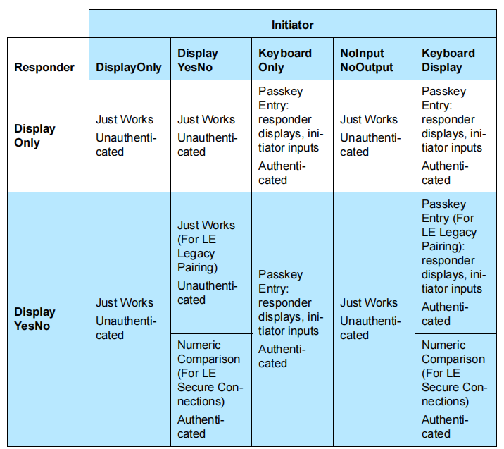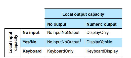 在LE 安全连接配对中,如果有一方或双方设备已从带外认证数据中删除,则在选择配对方法和使用配对方法时将忽略认证要求标志。 其他,设备应具有的IO能力用于确定表2.8中定义的配对方法。