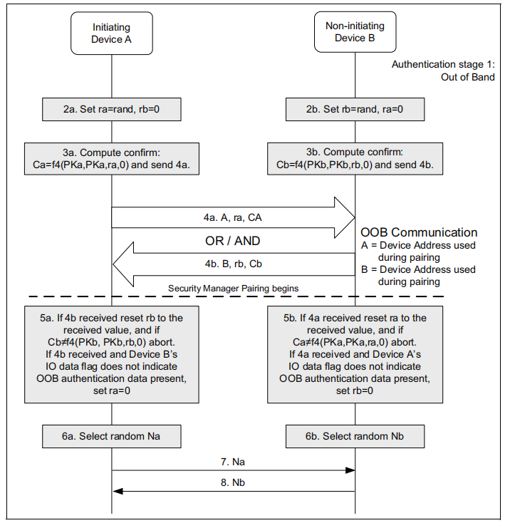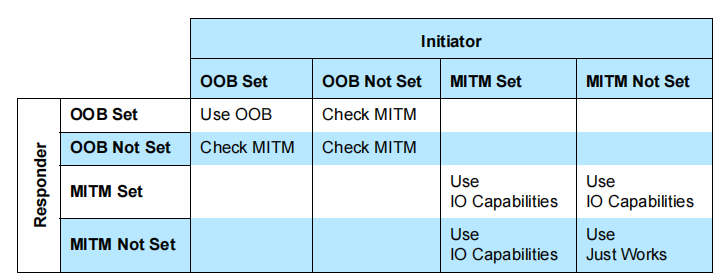 如果OOB通信抵抗MITM攻击,则这种关联方法也抵抗MITM攻击。 此外,在乐队方法之外,认证参数(TK)的大小不受用户可以舒适阅读或类型的限制。 为此,可以使用Passkey Entry或Just Works方法使带外方法更加安全。 但是,任何设备都需要匹配OOB接口。