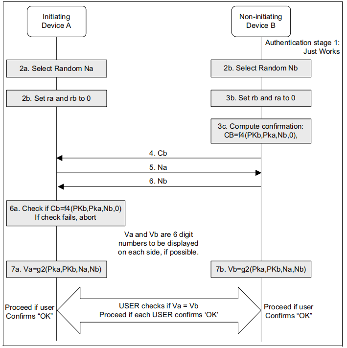 使用数字比较时,假设提交检查发生,两个设备计算6位数确认值,然后将其显示给各自设备上的用户(步骤7a,7b和8)。 预计用户将检查6位数字匹配值并确认是否匹配。 如果没有匹配,则必须生成“议定书”废除,并且如果要重复“议定书”,则必须生成新的nonces。