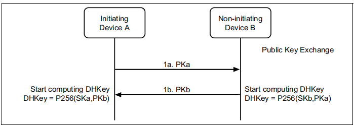 启动设备启动了配对,将其公共密钥路由到接收设备(第1a阶段)。 响应设备使用其自己的公钥回复(第1b阶段)。 这些公钥并非秘密地传达给他们,因为他们可以识别设备。