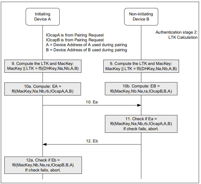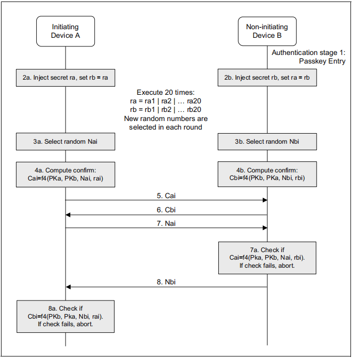 Passkey Entry STK生成方法在可能的TK值的有限范围内依赖于可能的TK值。 如果攻击者在互惠过程中不存在,则可以通过使用对未来连接的加密来建立信任和认证。