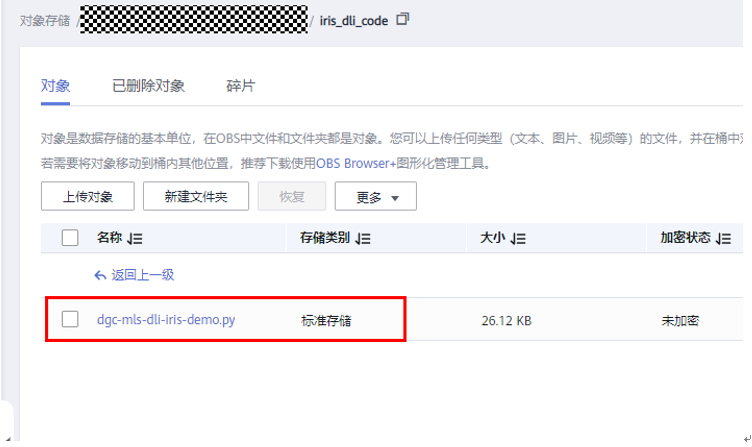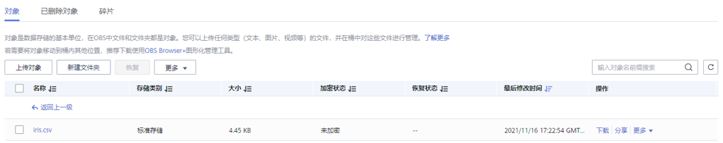 将iris.csv上传到obs,并记录下obs的路径,供下一节使用。