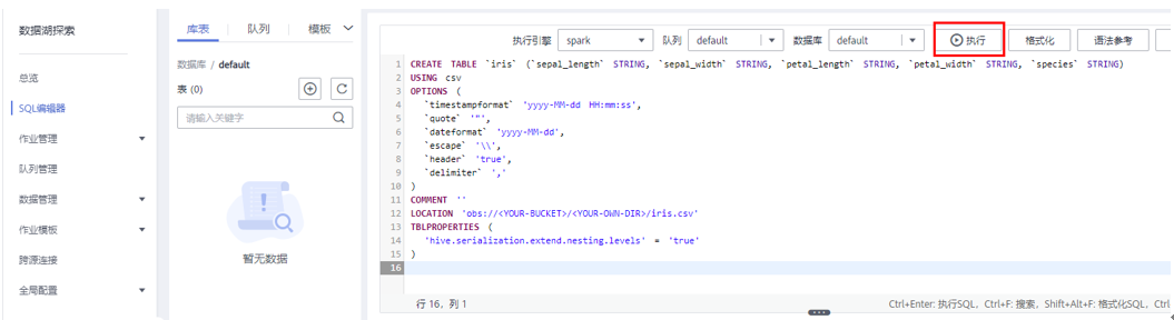 在上一节中,iris表被我上传到了obs://<YOUR-BUCKET>/<YOUR-OWN-DIR>/iris.csv