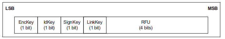 主机使用“配对请求”命令中的“启动器密钥分发/生成”字段来向启动器请求哪些密钥被分发或生成给响应器。“配对请求”命令中的“响应器密钥分发/生成”字段由主机用来请求响应器向发起器分发或生成哪些密钥。来自从机的“配对响应”命令中的“启动器密钥分发/生成”字段定义了启动器应向响应器分发或生成的密钥。来自从机的“配对响应”命令中的“响应器密钥分配/生成”字段定义了响应者应向发起者分发或生成的密钥。从程序不得设置为主程序在配对请求命令的启动器密钥分配/生成或响应器密钥分配/生成字段中的启动器密钥分配/生成或响应器密钥分配/生成字段中设置为零的任何标志。
