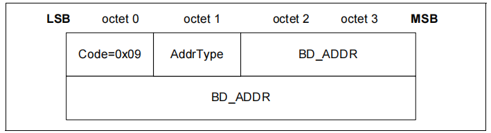 如果BD_ADDR是公共设备地址,则AddrType应设置为0x00。如果BD_ADDR是一个静态随机设备地址,则AddrType应设置为0x01。
