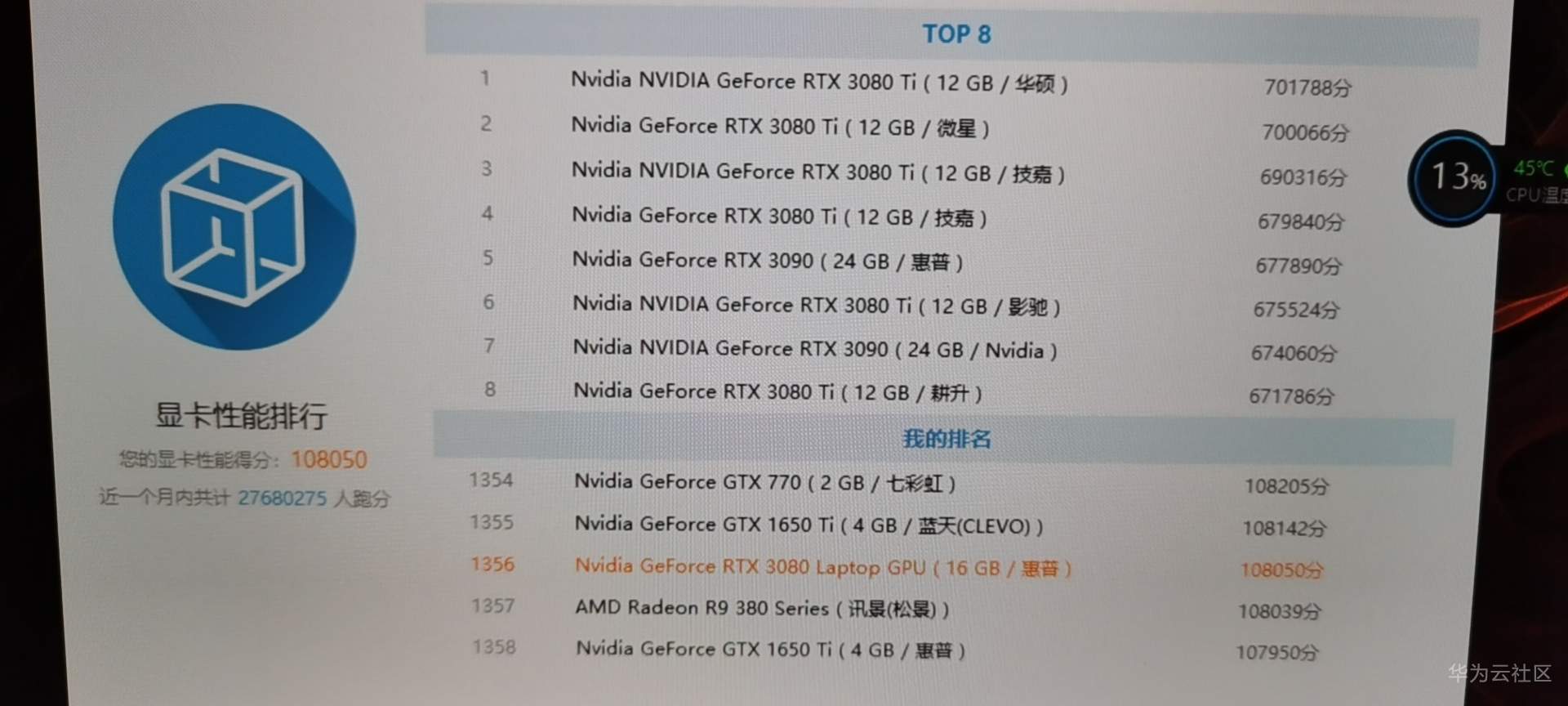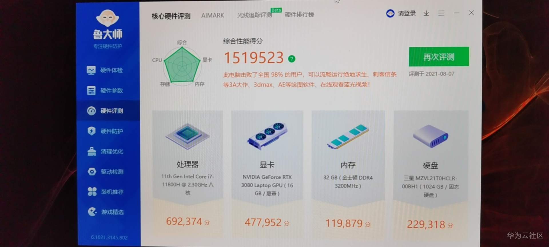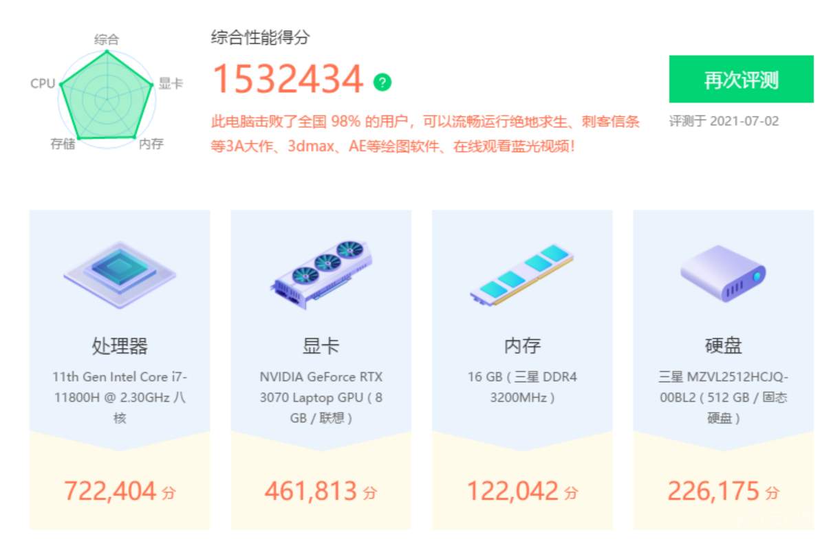 同等CPU+3070 笔记本显卡的:(网友数据截图)