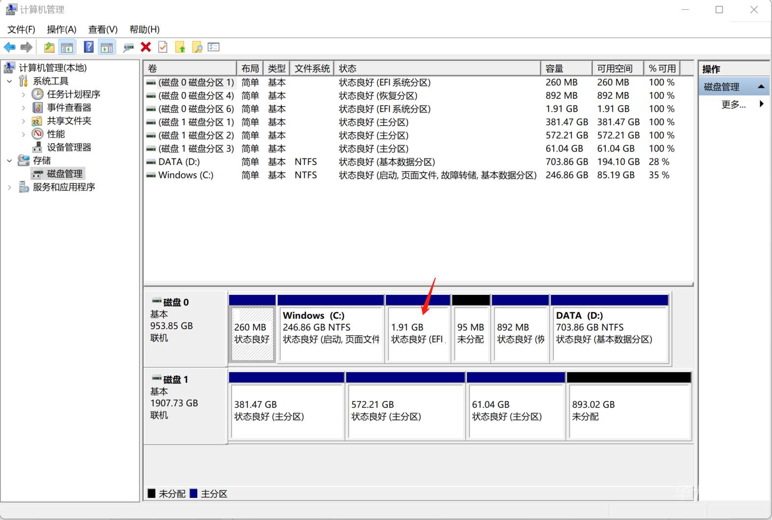 安装完硬盘后,盖上后盖,开机,打开windows,可以在“计算机管理”的磁盘管理中看到刚安装好的硬盘:(下图中的磁盘一,大小为1907.73GB)