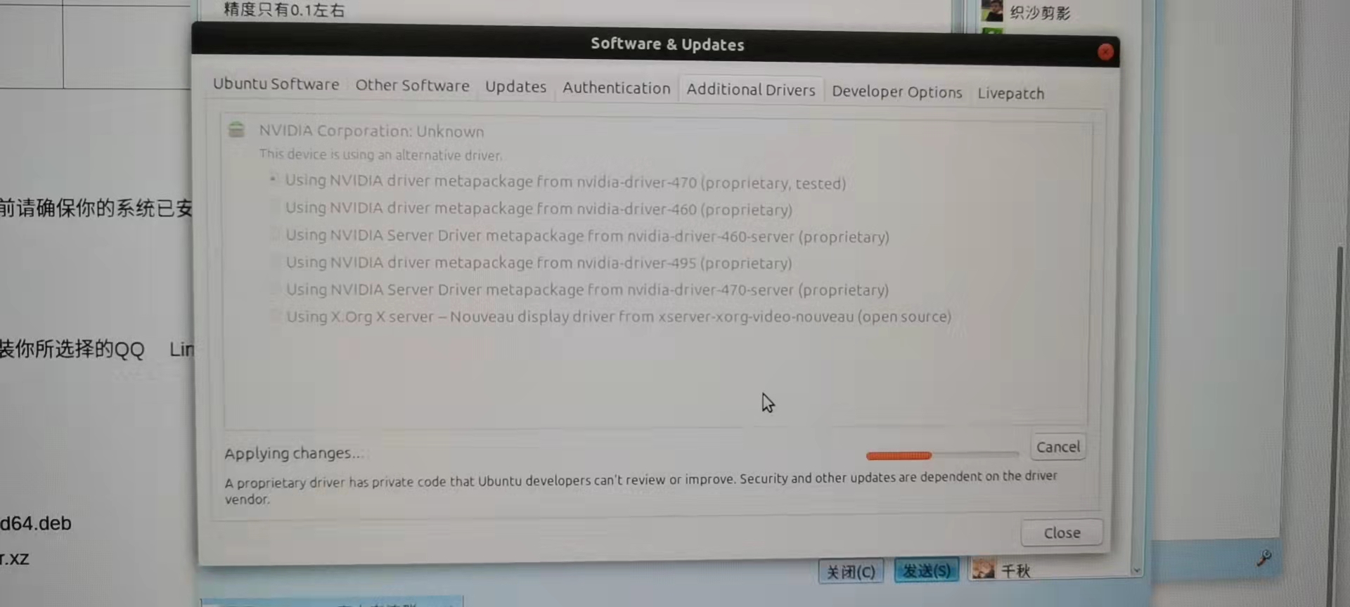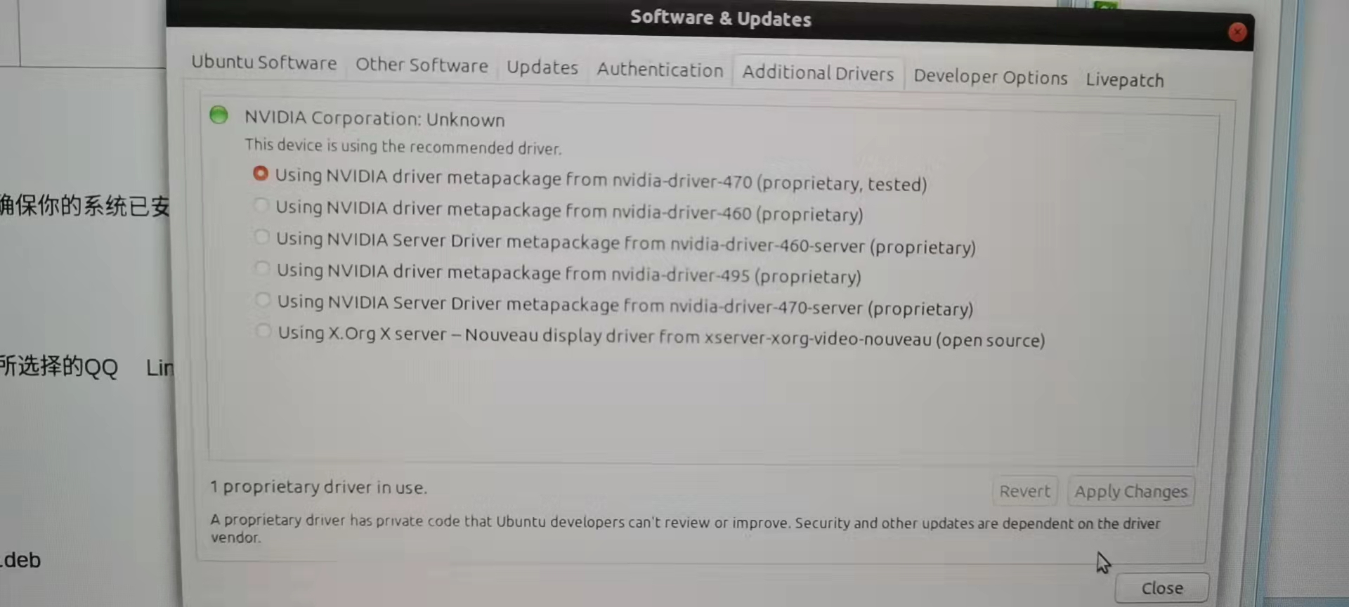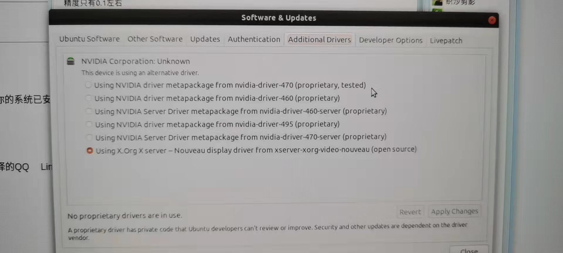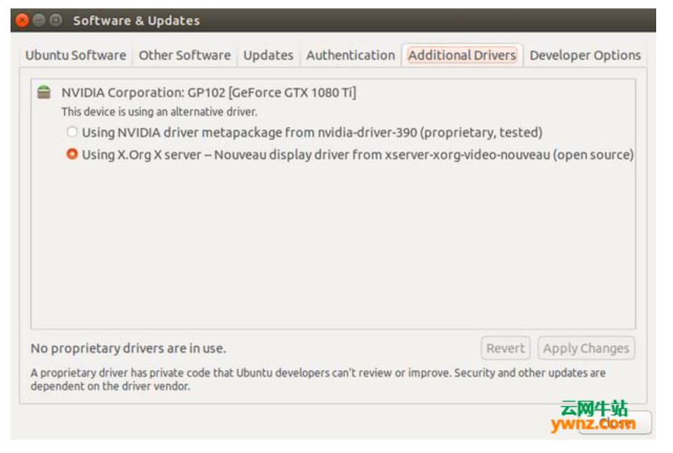 张小白恍然大悟,他打开了ubuntu系统更新(software & updates)的页面,切换到Additional Drivers页签,原来的选择是最后一个:
