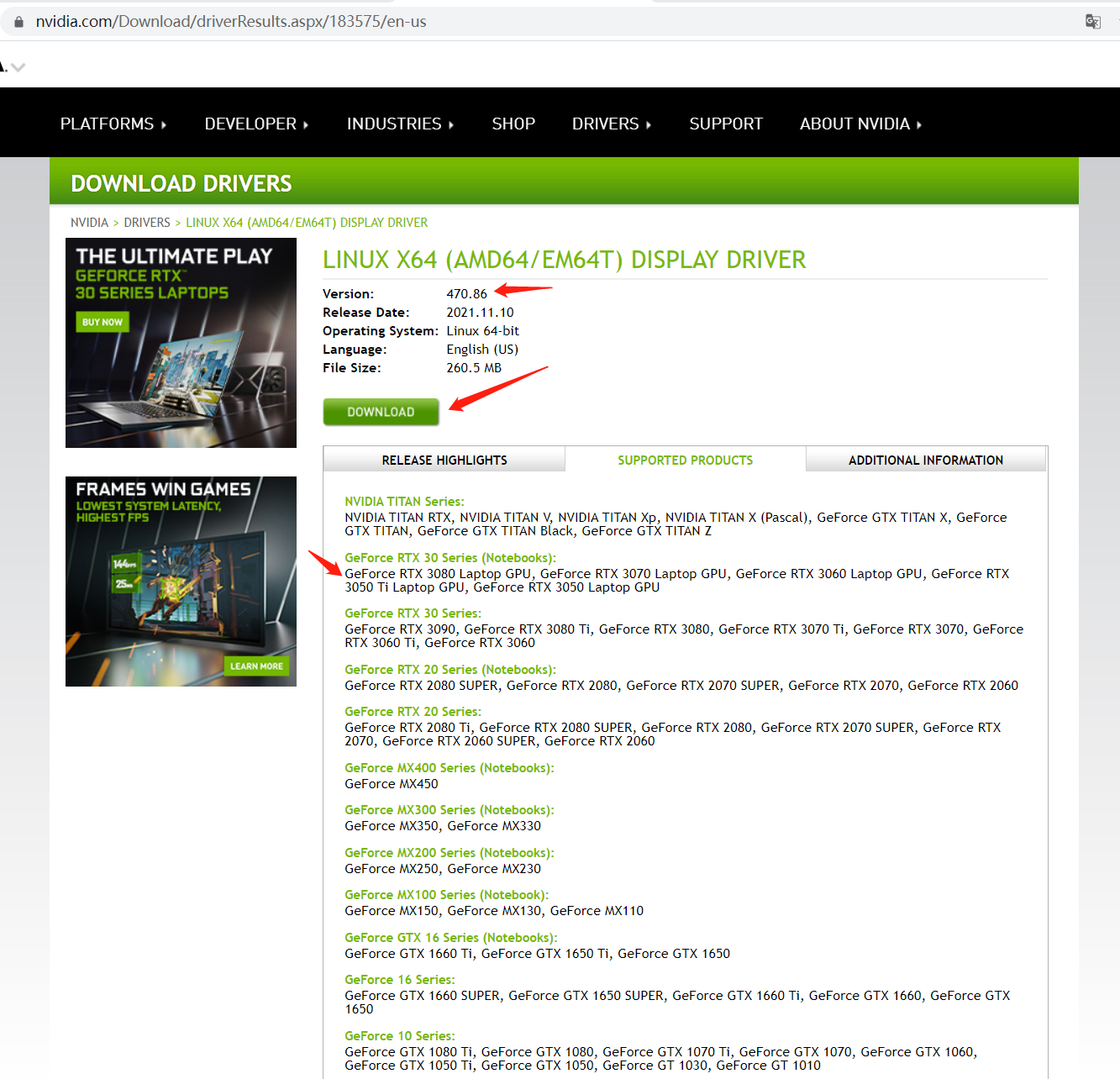 在弹出的结果页面点击download即可下载nvidia驱动。(看support页签是支持3080移动版显卡的)