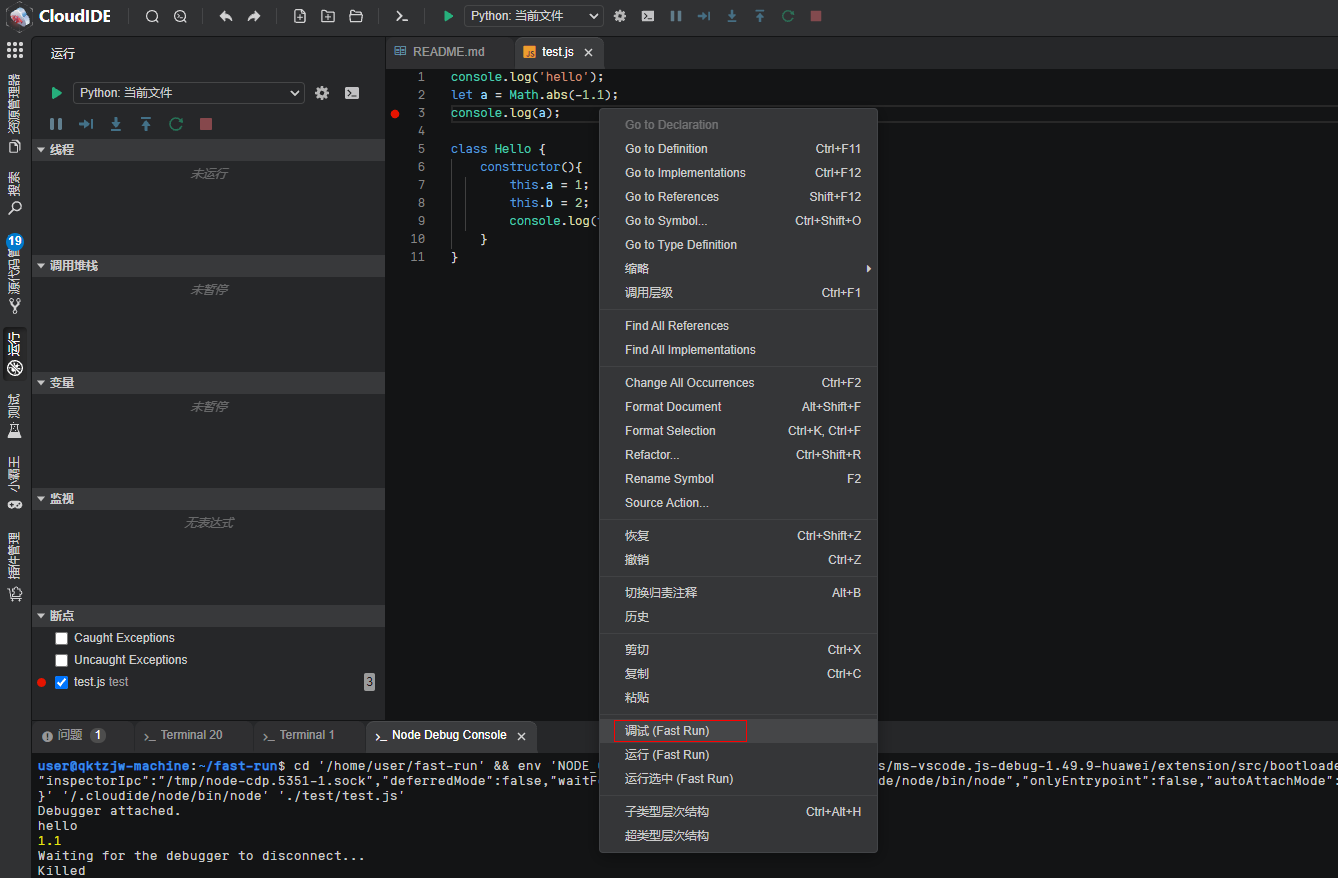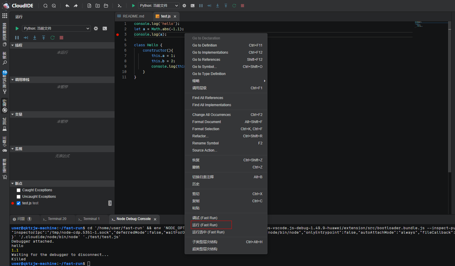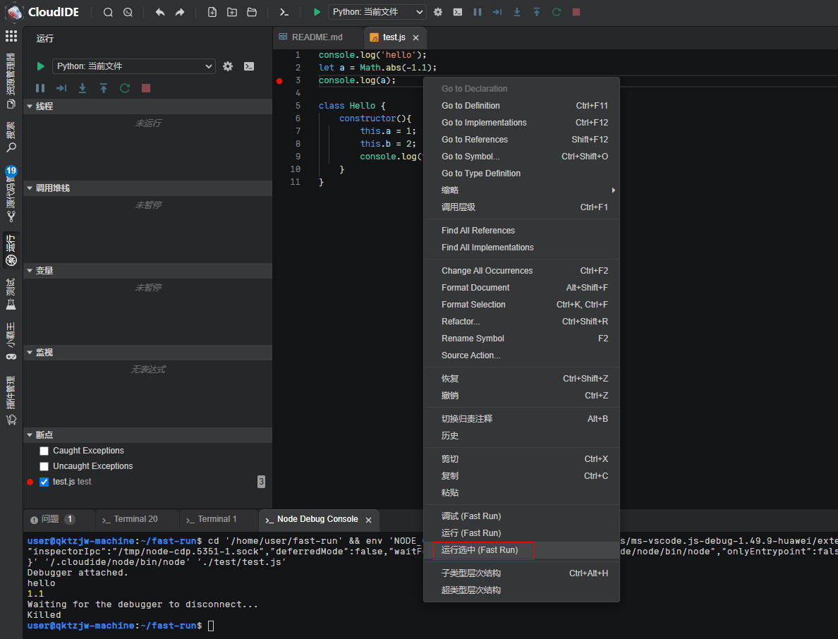 3.快速调试需要再打开的文件中打上断点,并且通过右键菜单的"调试 (fast-run)"选项进行快速调试。