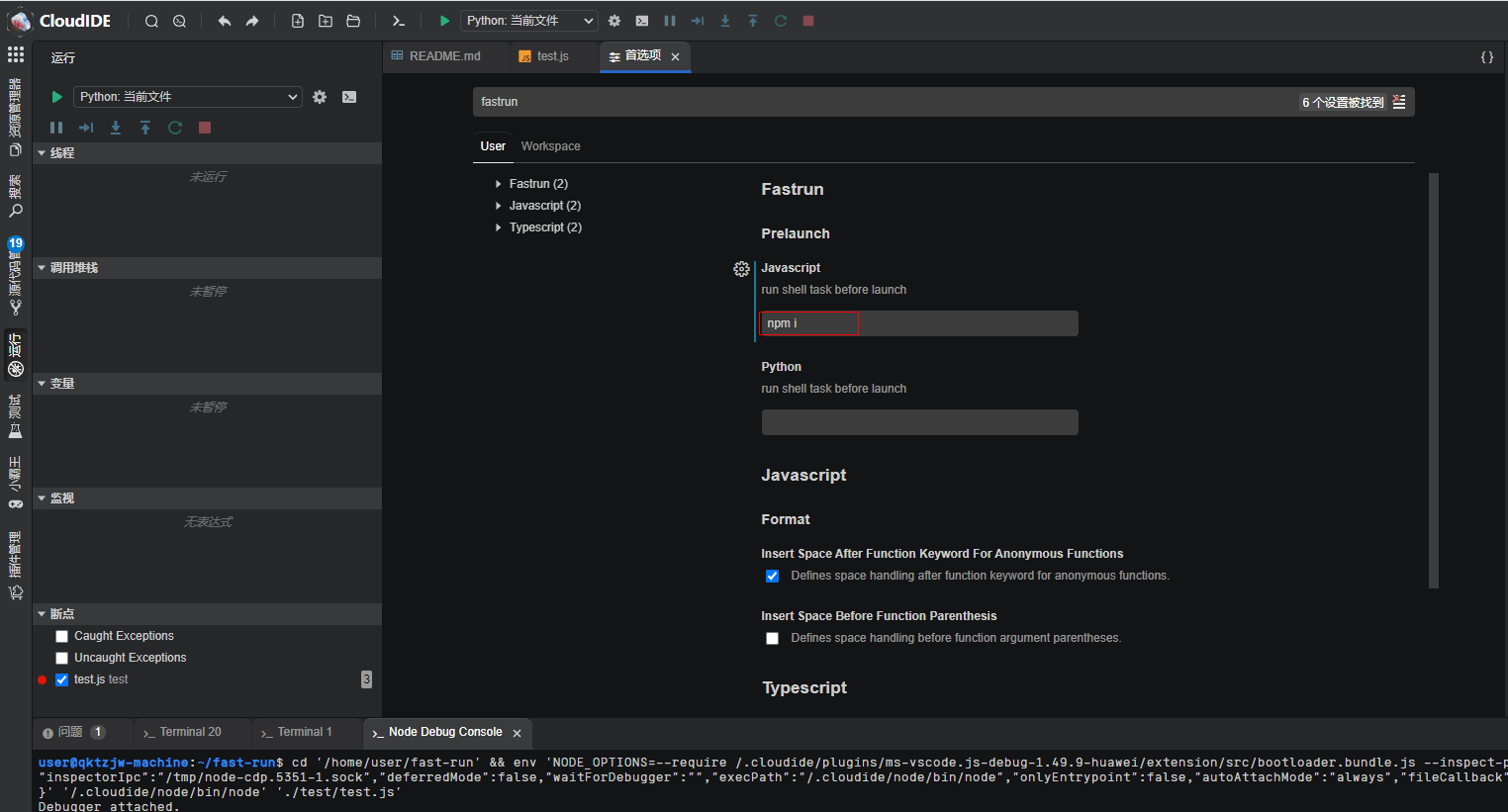 【摘要】 安装fast-run插件可以通过插件市场进行快速安装,在插件市场搜索fast-run,并选择安装。 快速运行/调试代码1.打开需要运行/调试的文件,当前支持Python和Javascript的代码。2.快速运行可通过右键菜单的“运行 (fast-run)”选项快速执行当前打开的文件。3.快速调试需要再打开的文件中打上断点,并且通过右键菜单的"调试 (fast-run)"选项进行快速调试。4...