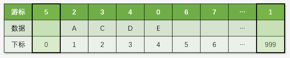 下标 0 所对应的游标 5 指向数组当中没有存放数据的第一个元素,即下标为5的元素