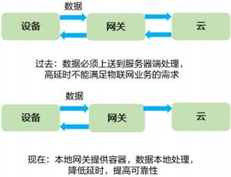 过去数据处理的方式与上图相同,数据从设备产生,并且上传到网关,但是网关没有计算能力,就只能充当一个传输的作用,之后再把数据上传到云端来进行处理。但是现在不一样了,当网关具备了计算能力之后,它可以先把要求低的一些数据先帮远端处理了,但是要注意的是处理完了之后还是要向中心节点反馈“数据已经处理过了”的一个信息。